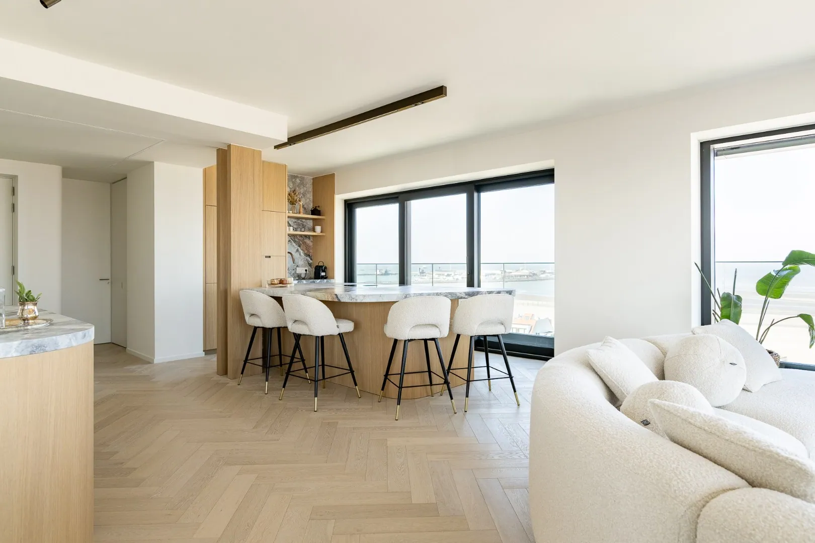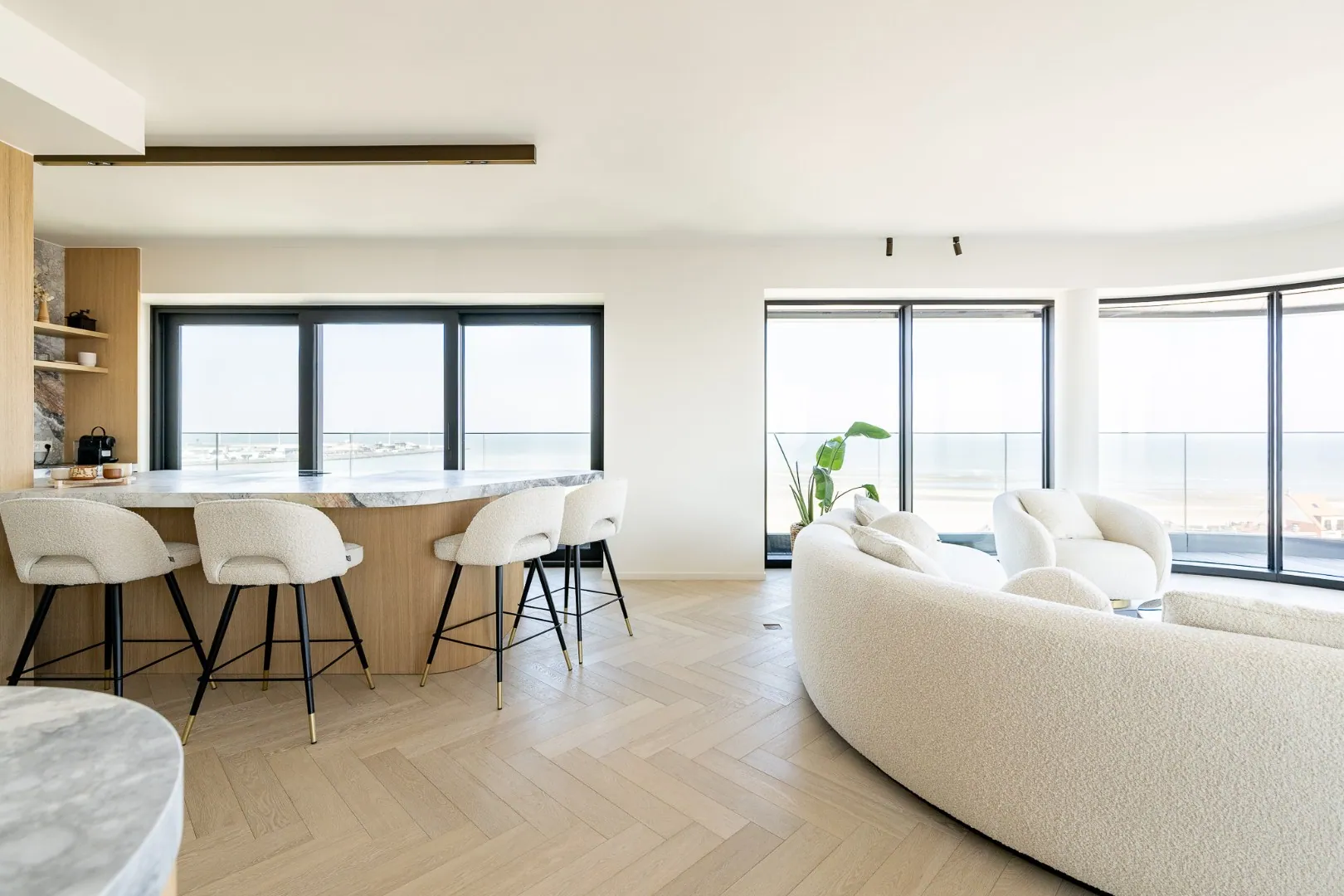 - Prachtige leefruimte met grote open keuken, gezellige zithoek en eetruimte, allemaal badend in licht en genietend van uitzonderlijke panoramische uitzichten op zee en het hinterland.