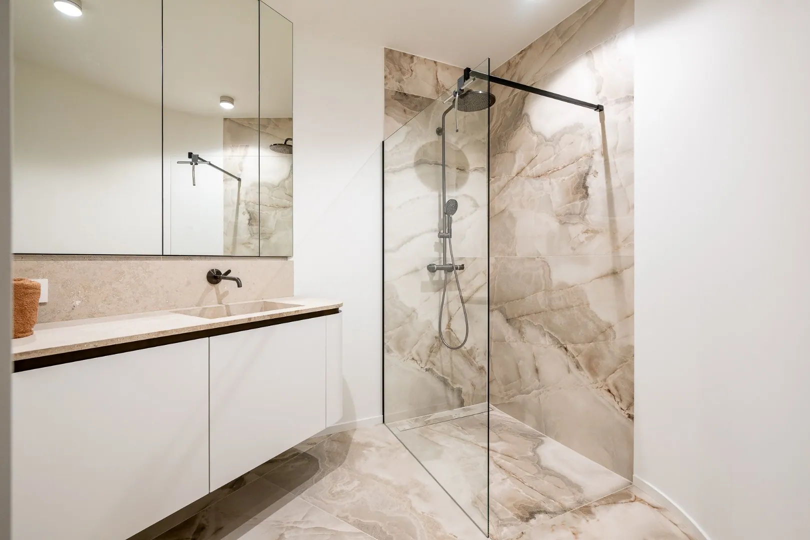 - Twee slaapkamers, telkens met ingemaakte kasten en een royale badkamer en-suite (masterbedroom met ligbad én douche uitkijkend op de zee).
