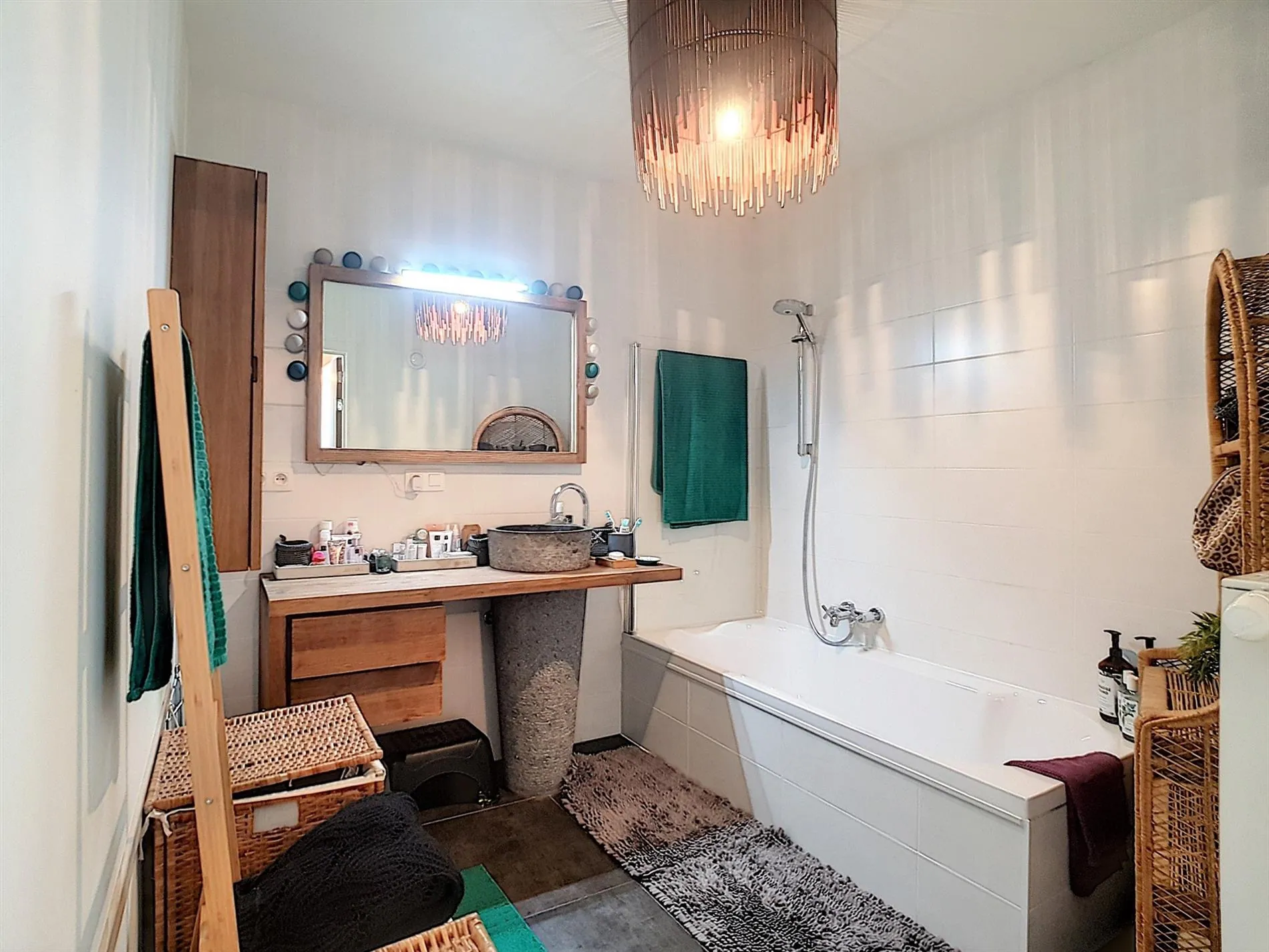 - Knappe badkamer met ligbad & douchescherm en lavabo,
