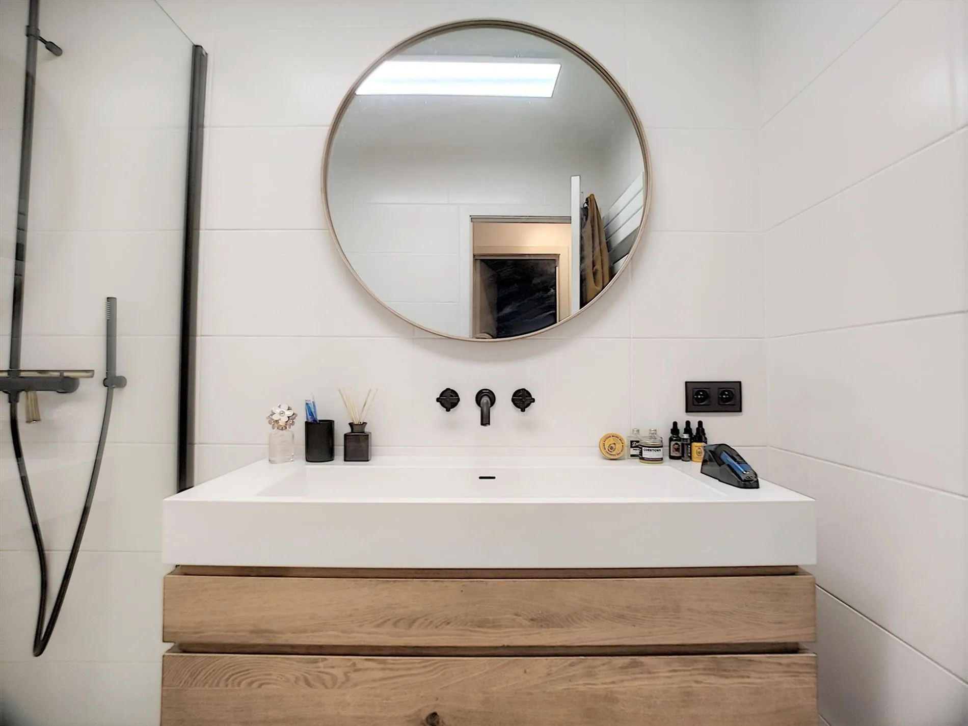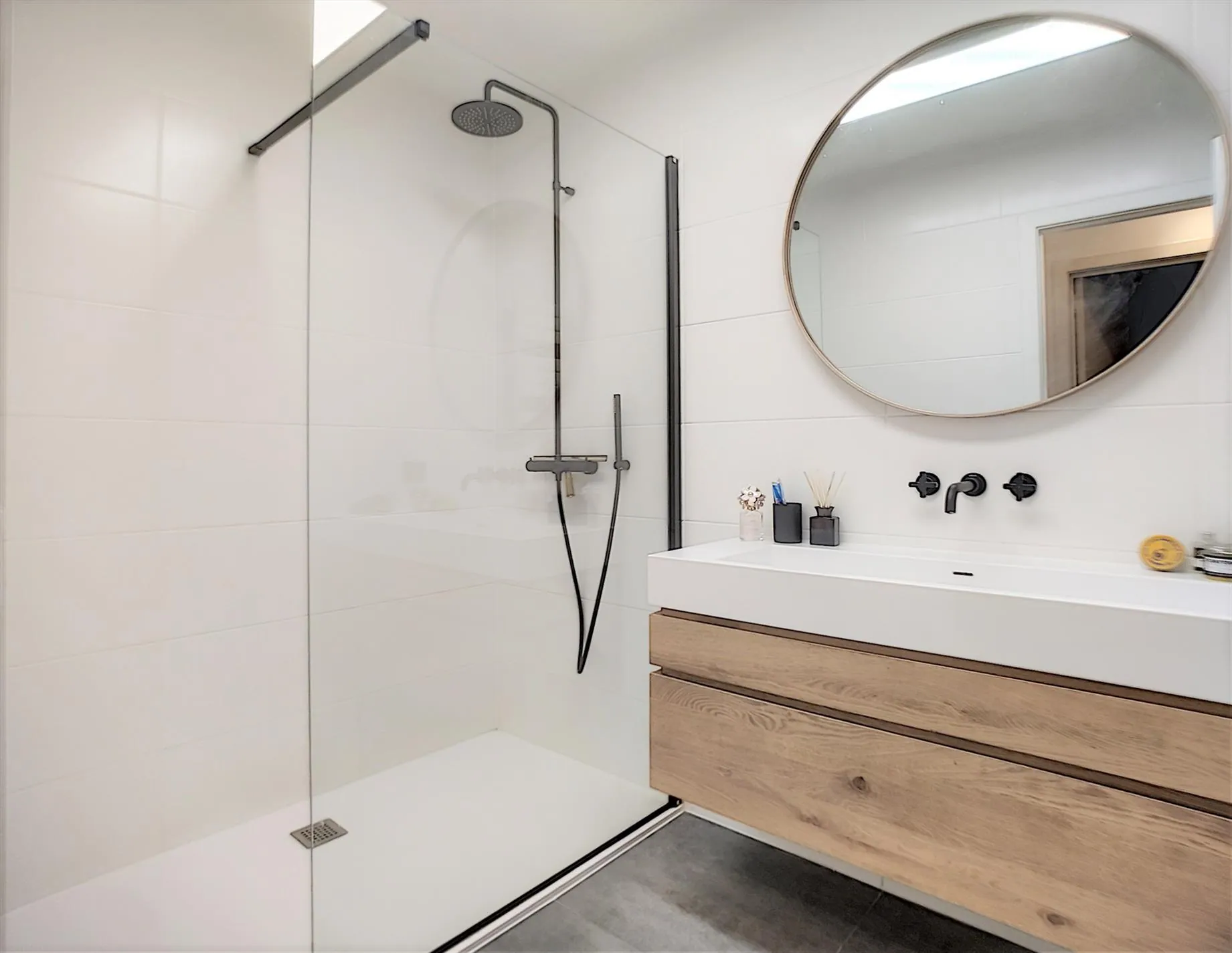 - Knappe badkamer met inloopdouche en wastafel + meubel.
