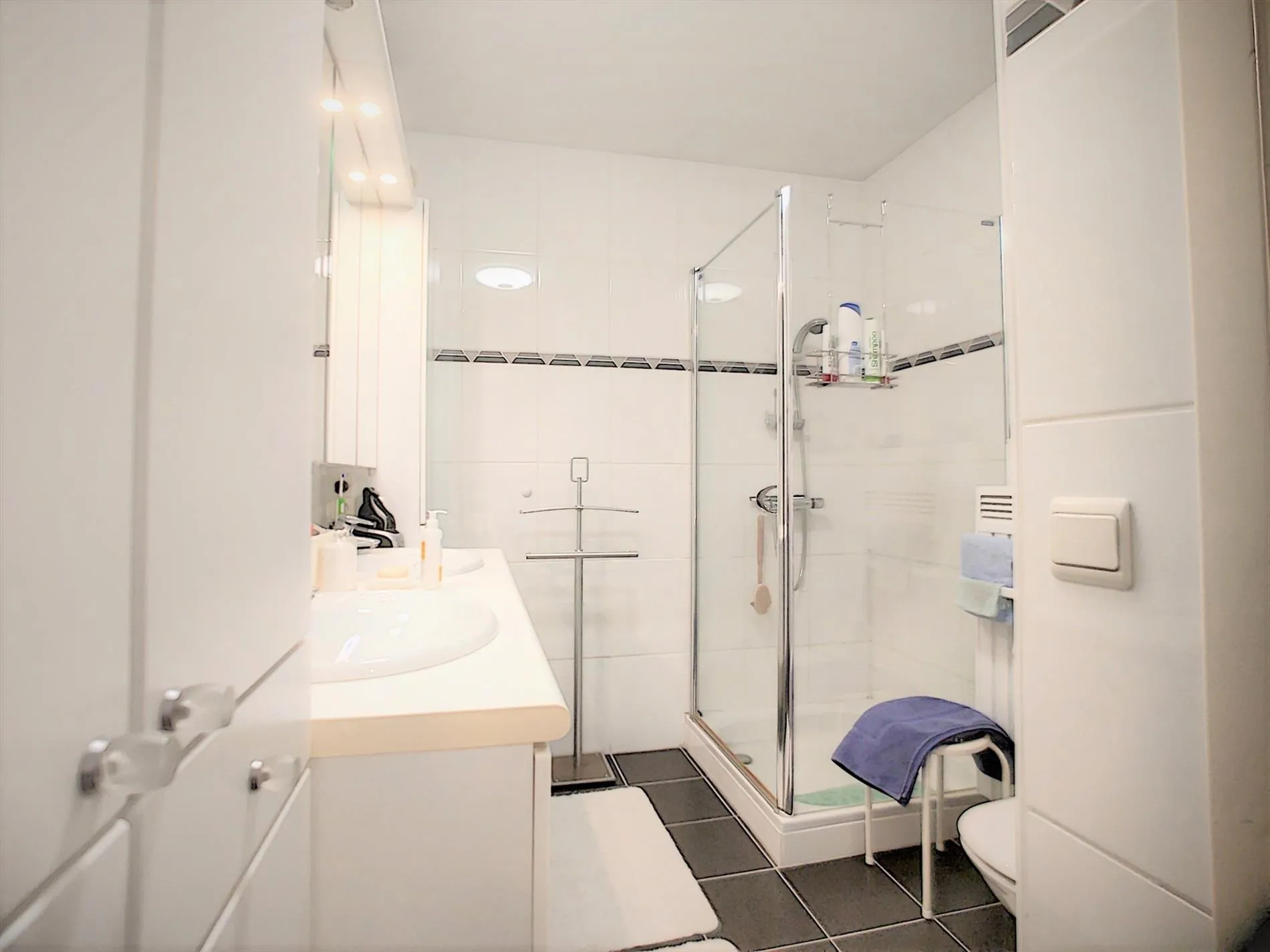 - Badkamer voorzien van douche, dubbele wastafel & toilet.