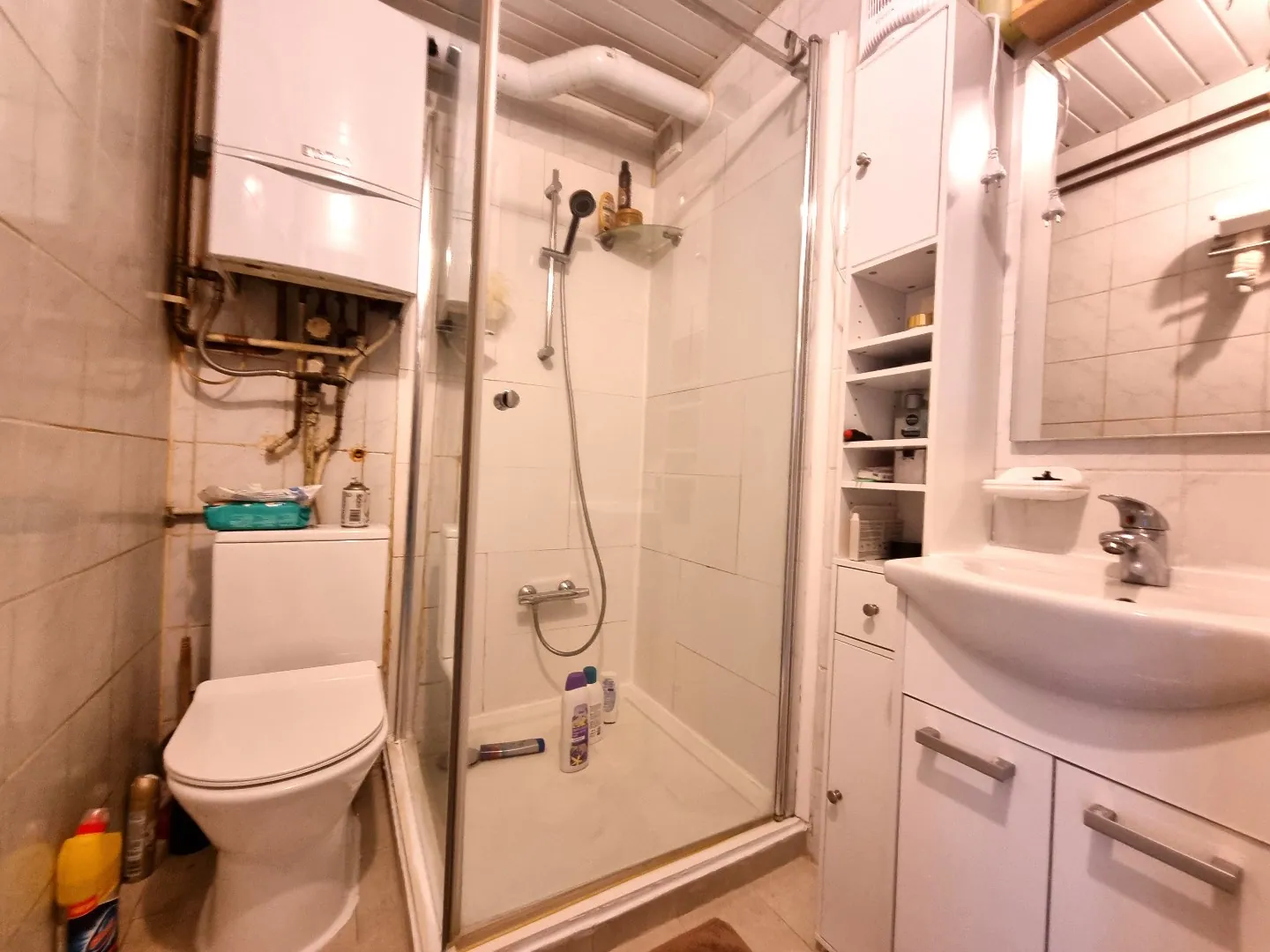 - Badkamer met douche, lavabo en wastafel.
