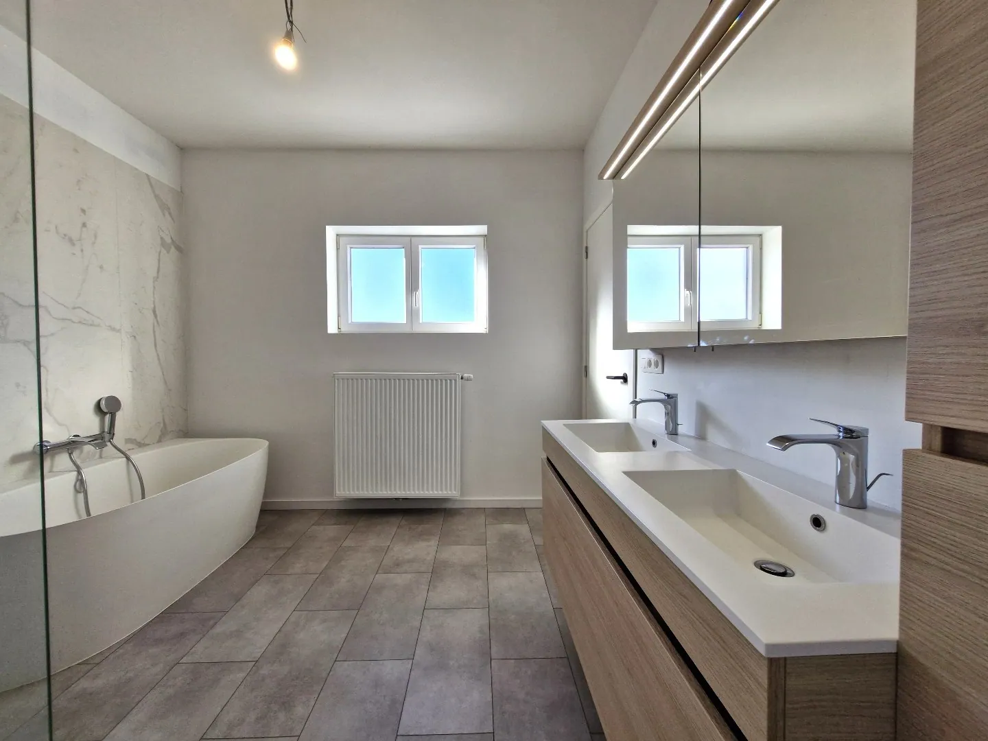 - Badkamer voorzien van ligbad, inloopdouche en dubbele wastafel/meubel,