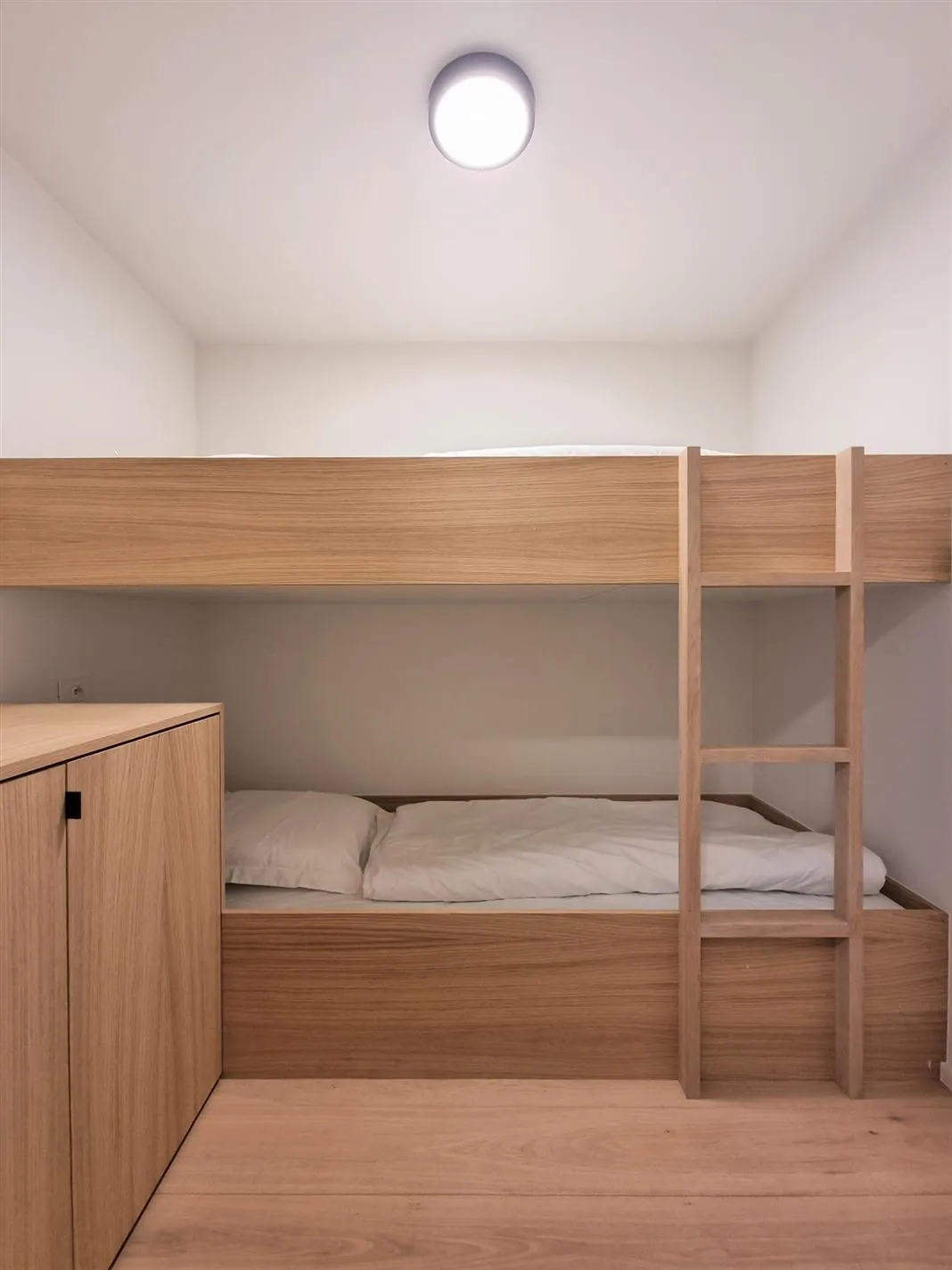 - 2 slaapkamers met prachtig maatwerk. De kleinste slaapkamer werd voorzien van een ingebouwd stapelbed, de hoofdslaapkamer van zeer mooie ingemaakte kasten.