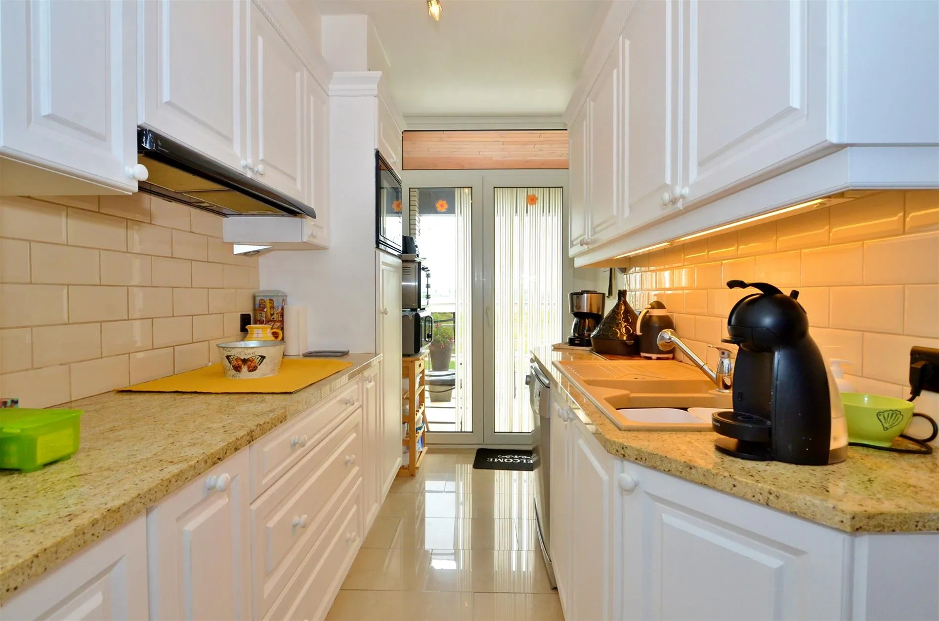 Hall met gastentoilet en berging met aansluiting voor de wasmachine, gezellige leefruimte met ingemaakte kasten en haard, ingerichte keuken, terras grenzend aan de keuken, 2 volwaardige slaapkamers met toegang tot het terras achteraan.