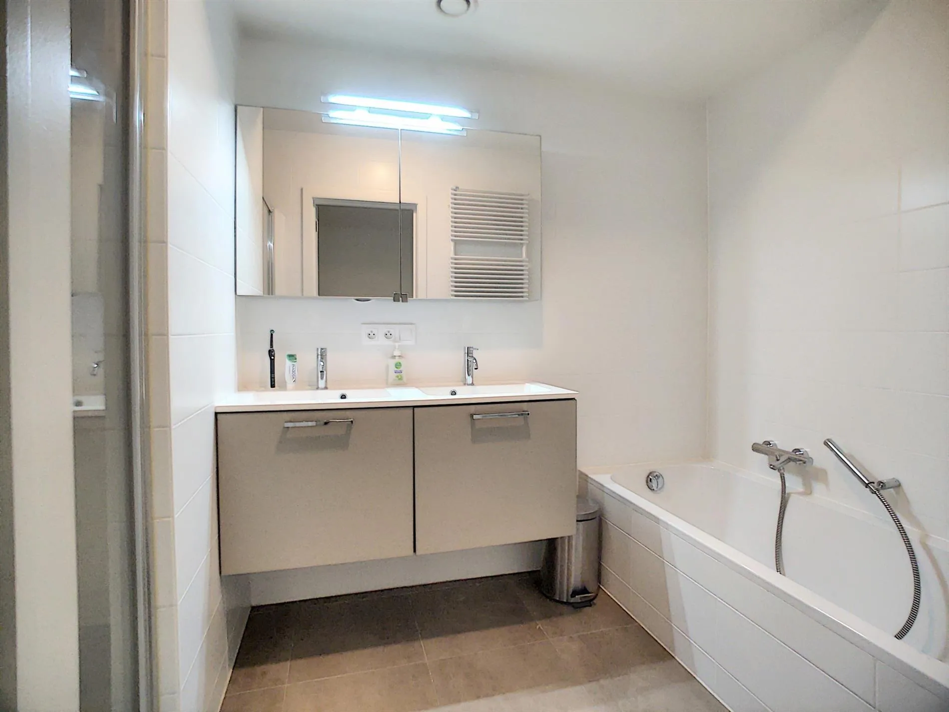 Het appartement is voorzien van een inkomhal met gastentoilet, lichtrijke leefruimte met zit -en eethoek, een open, ingerichte keuken, aangename tuin (met uitweg!), twee slaapkamers (waarvan één met ingemaakte kasten), een badkamer voorzien van een ligbad, dubbele wastafel & douche en een berging met aansluiting voor de wasmachine en droogkast.