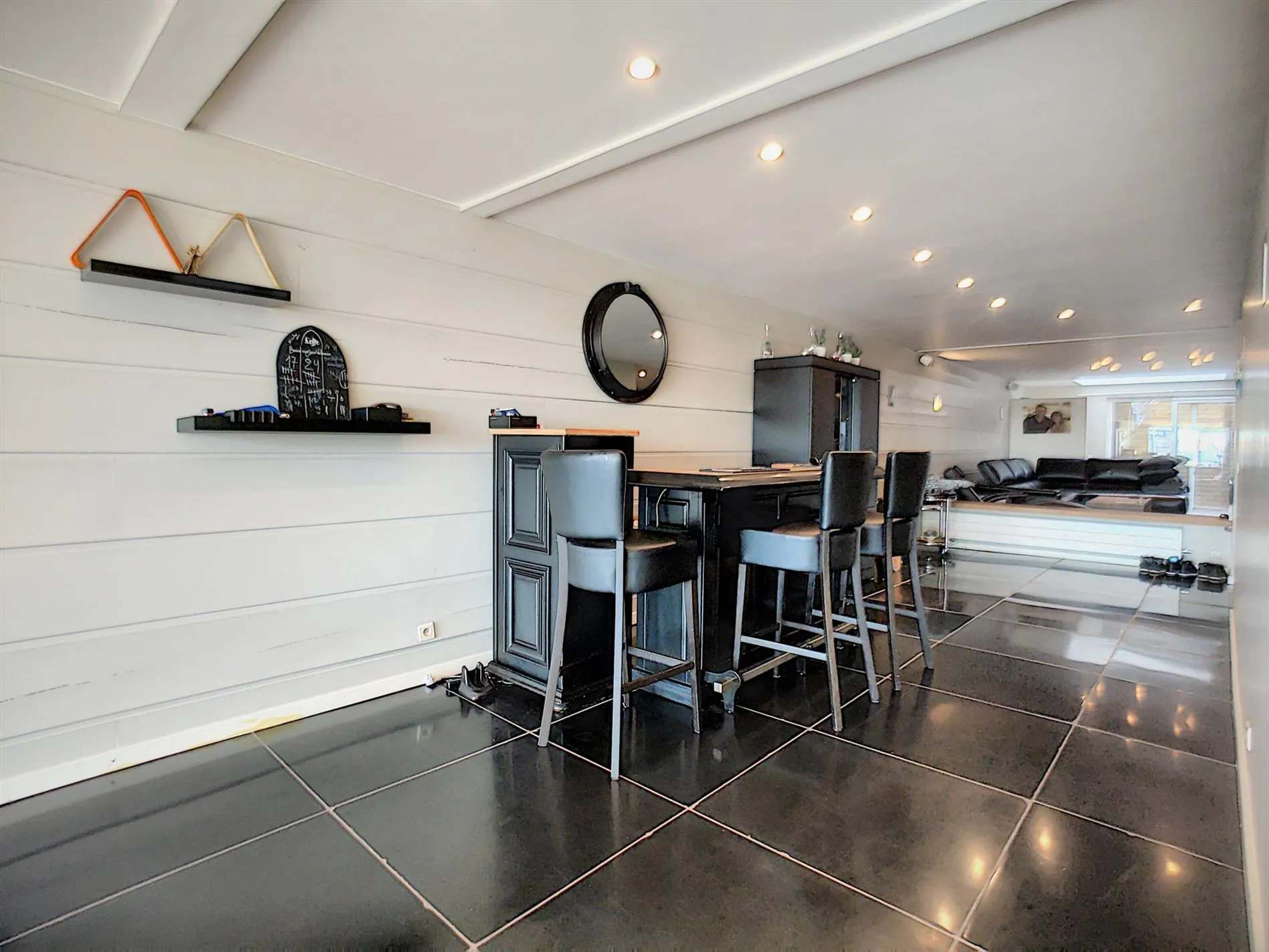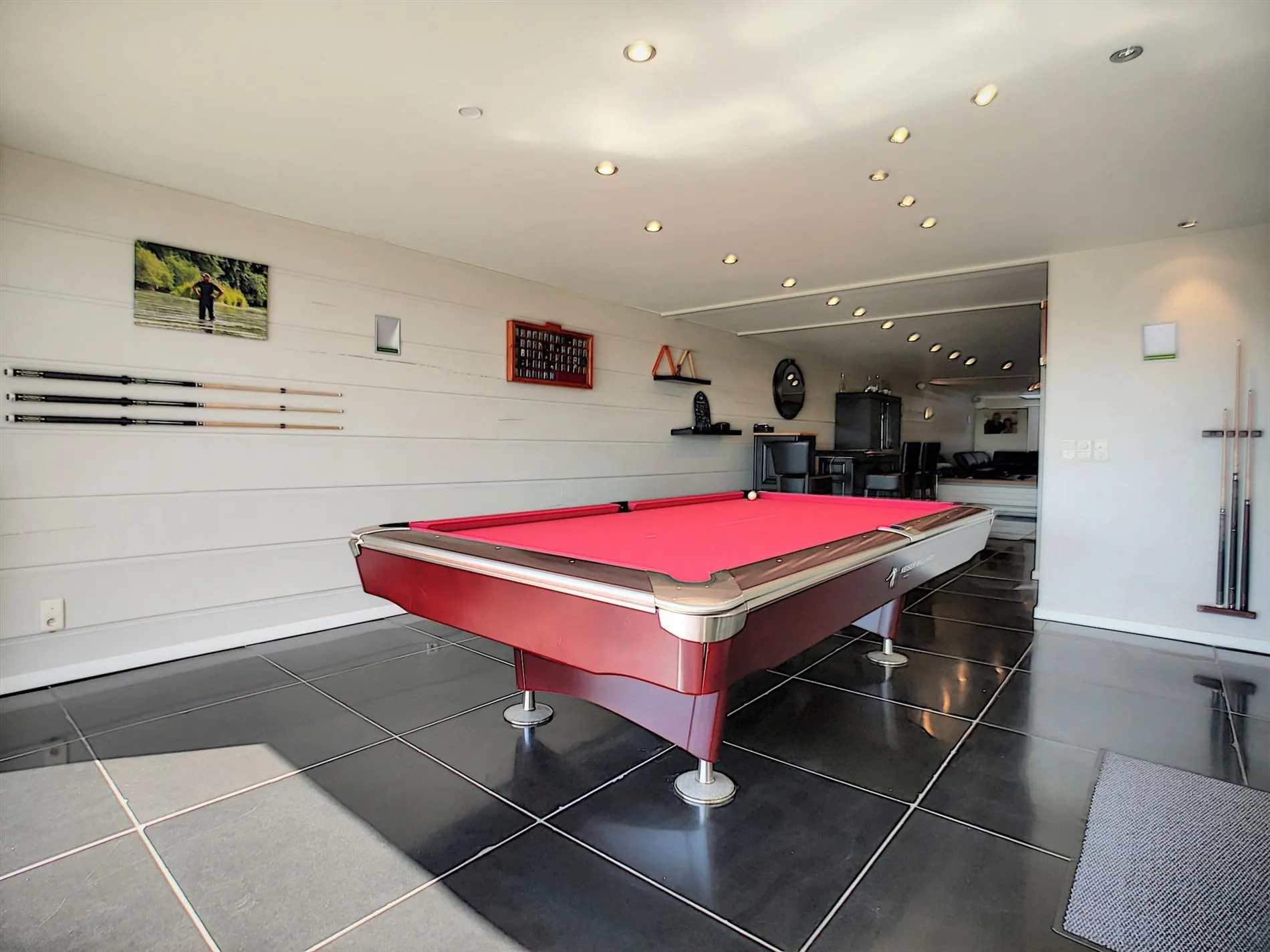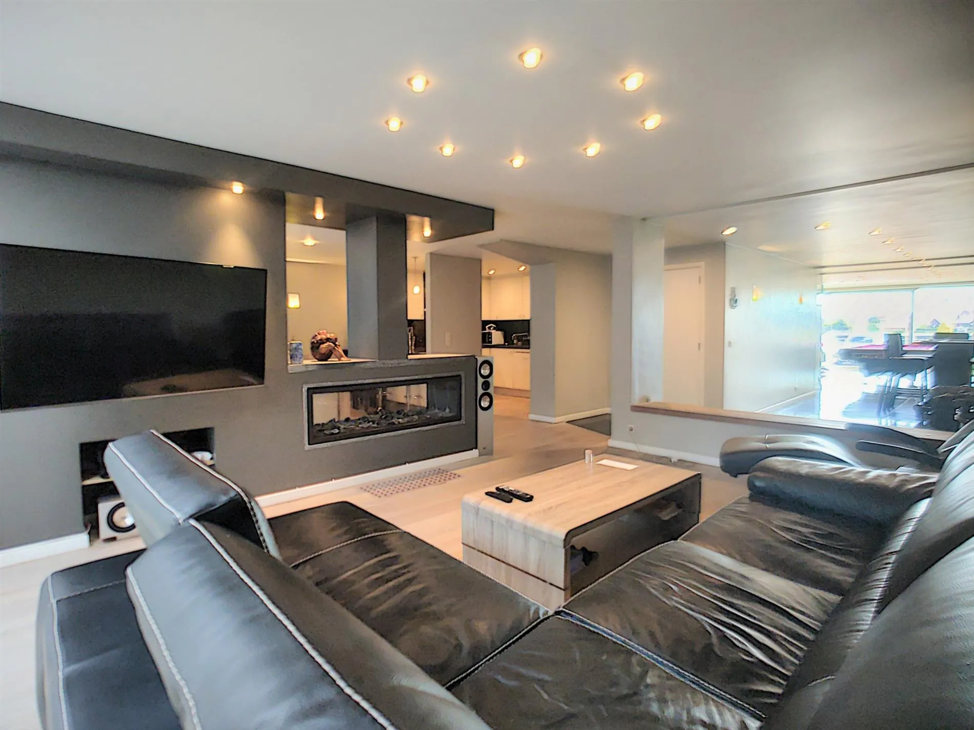 Indeling: ruimte die als heden wordt gebruikt als ontspanningsruimte met bar & biljart met doorgang naar de living die voorzien is van een aparte zit-en eethoek met een 2-zijdige openhaard op gas en Franse eiken vloer,