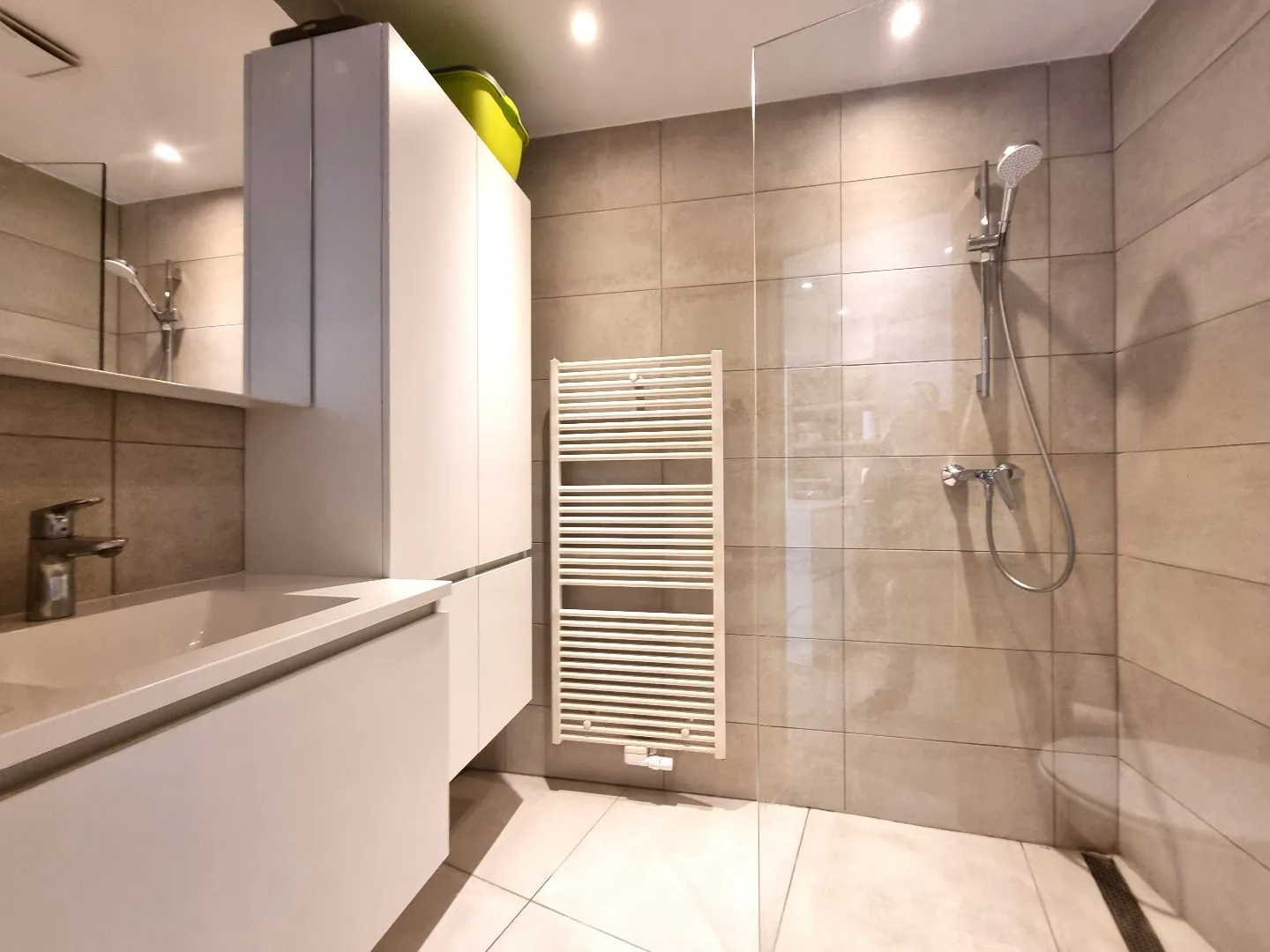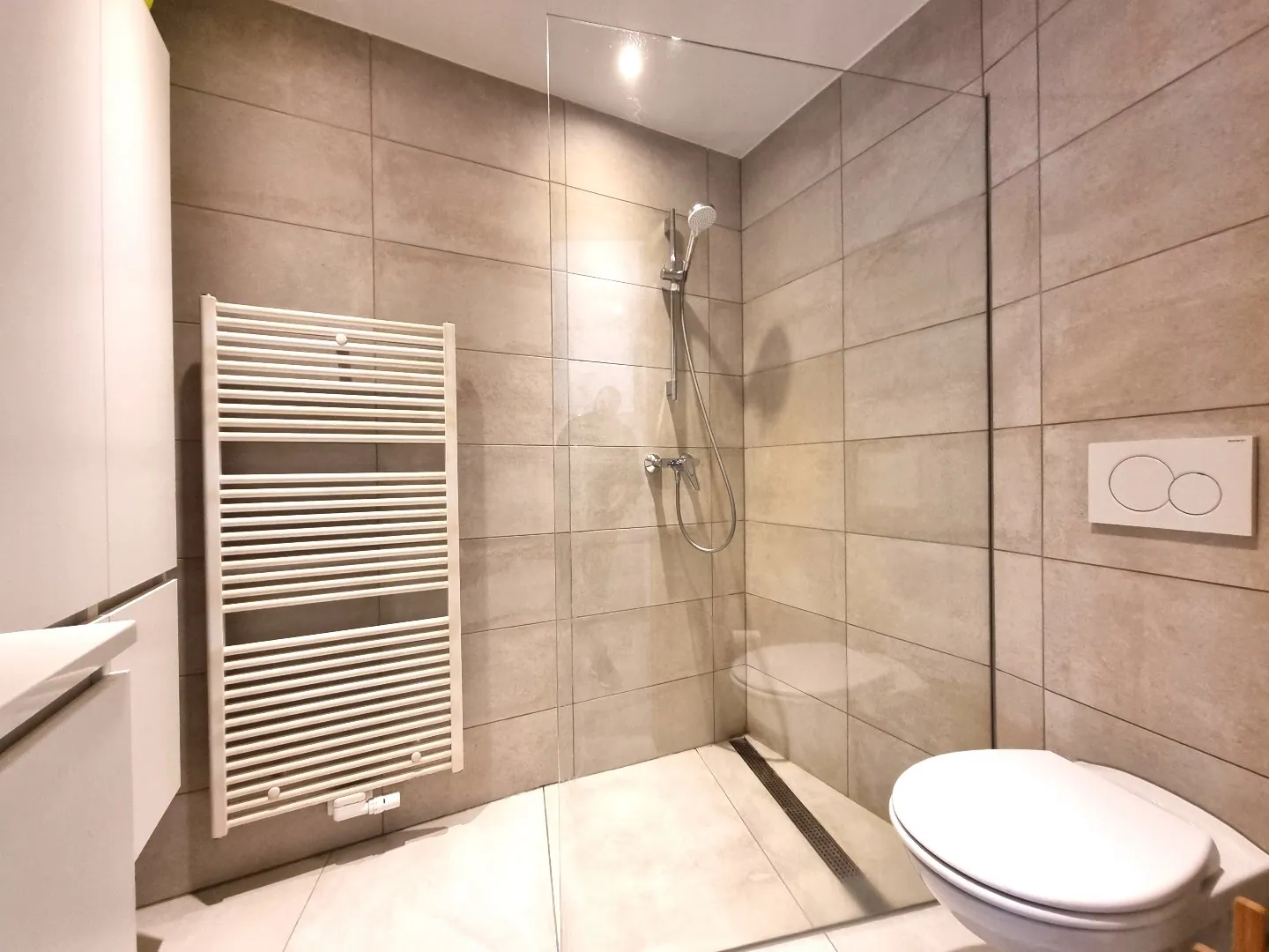 - Knappe badkamer voorzien van inloopdouche, lavabomeubel en toilet.