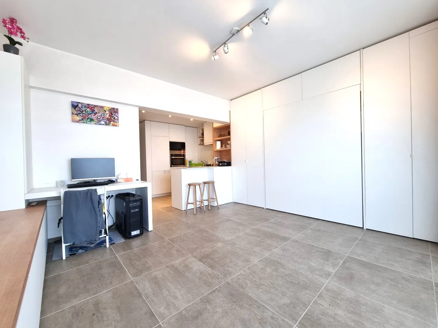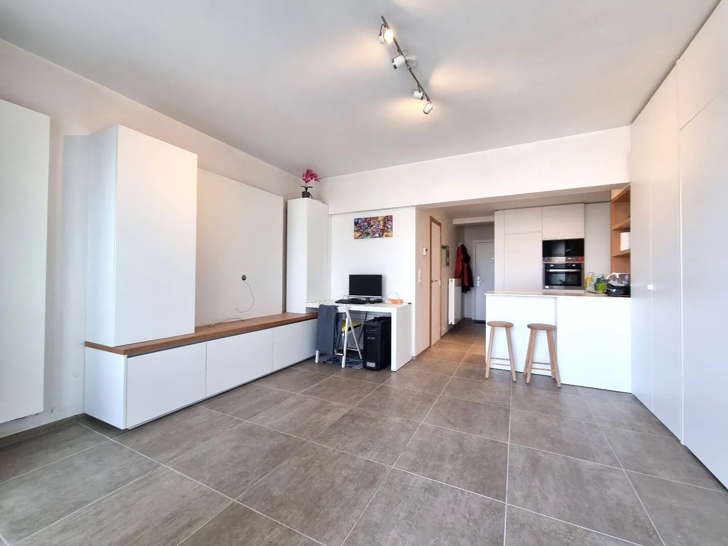 - Lichtrijke leefruimte. Ingemaakt TV-meubel, bedkast en ingebouwde kasten aanwezig.