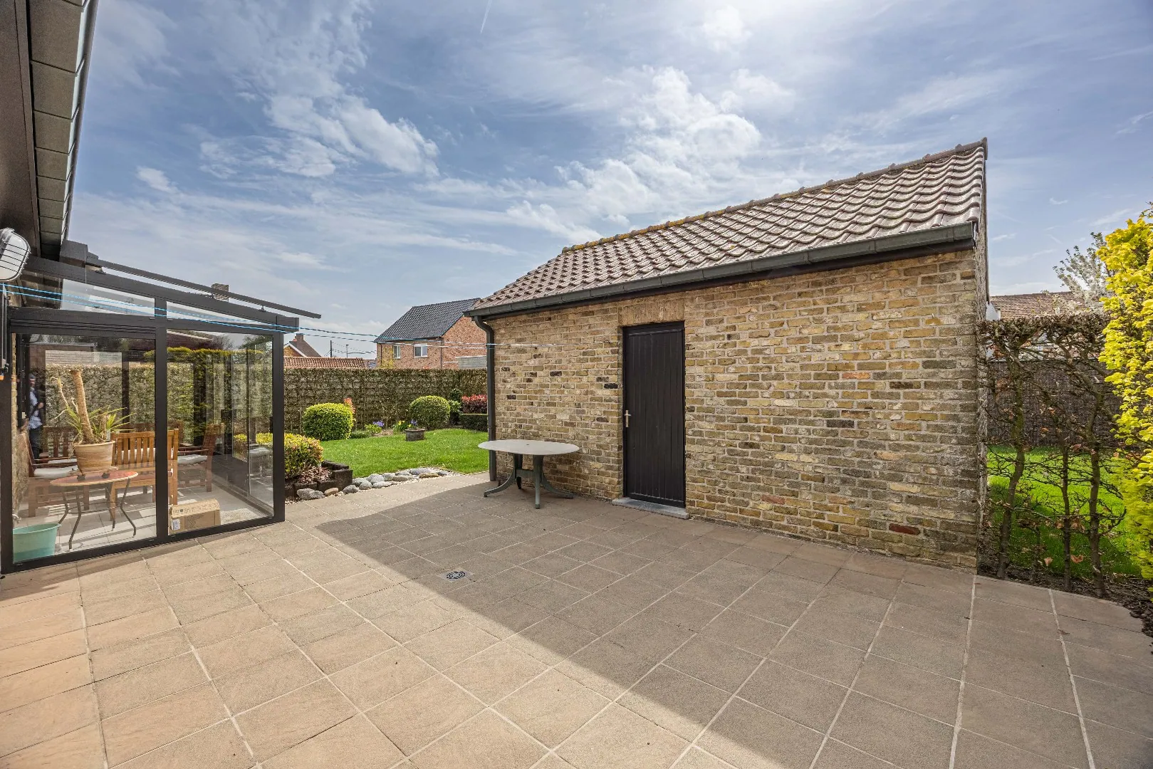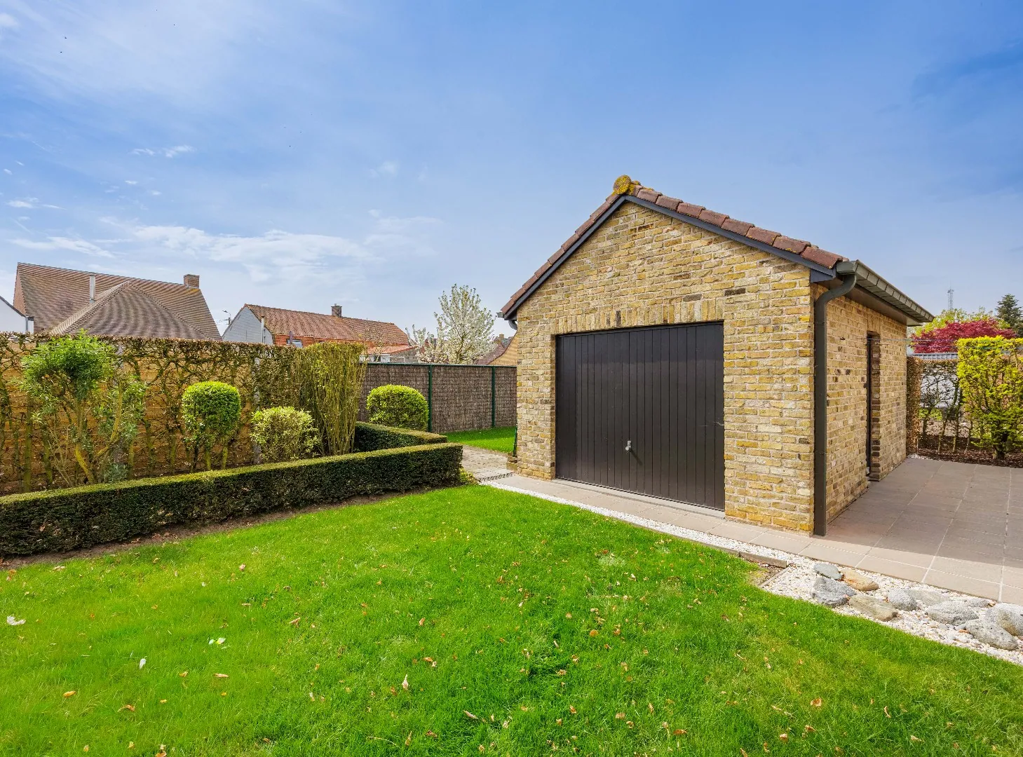 De woning beschikt over een verzorgde en fraai aangelegde tuin, een oprit met garage en een stevige, praktische tuinberging. Daarnaast is er een droge en toegankelijke kelderberging aanwezig. De betonnen tussenvloeren zorgen voor extra stabiliteit en comfort, terwijl ook bovenaan parketvloeren werden voorzien, waaronder een stijlvolle mozaïekparket.