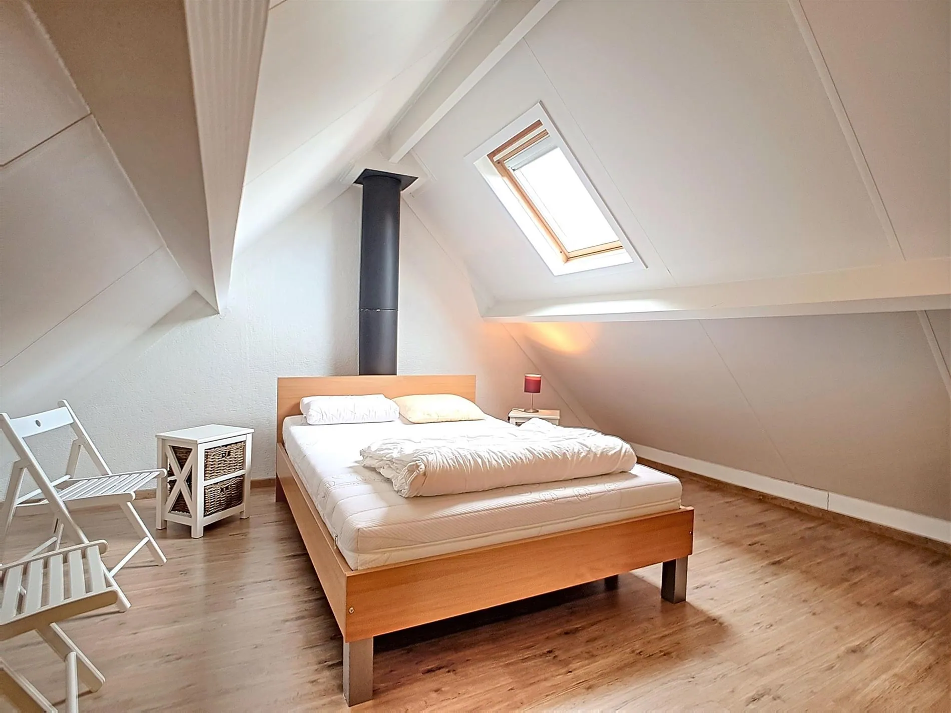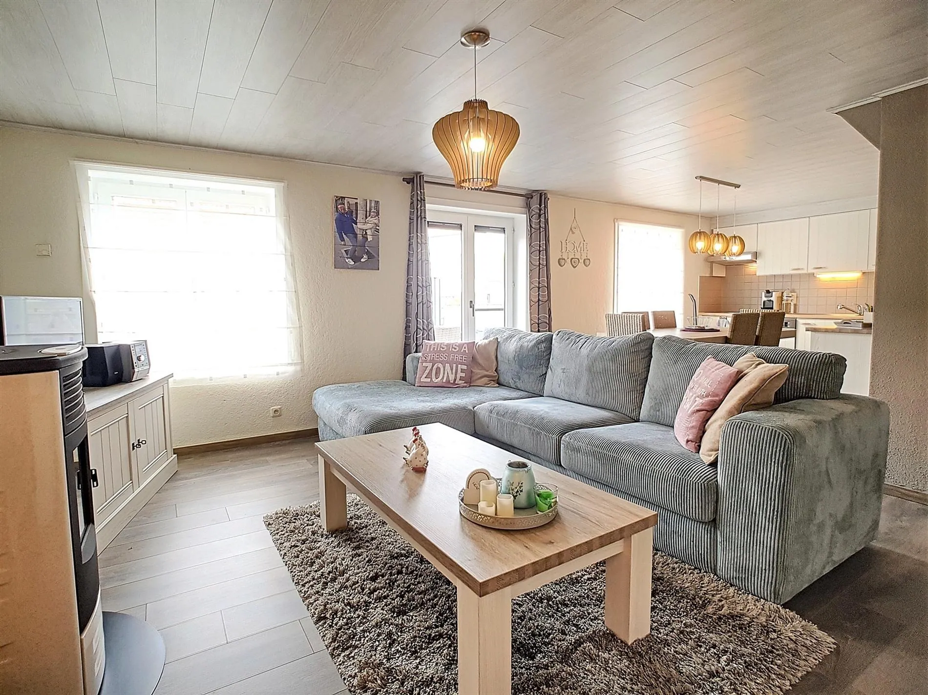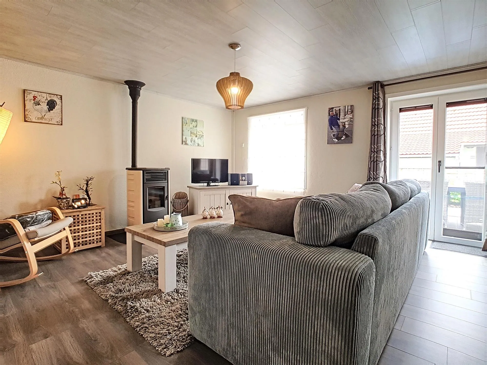 - Lichtrijke, aangename leefruimte met zit -en eethoek. De aanwezige pelletkachel zorgt voor extra gezelligheid in de koudere periodes.