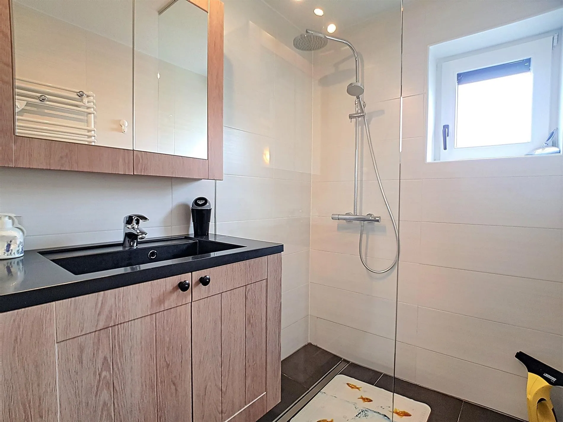 - Gerenoveerde badkamer met knappe inloopdouche en wastafel met meubel.