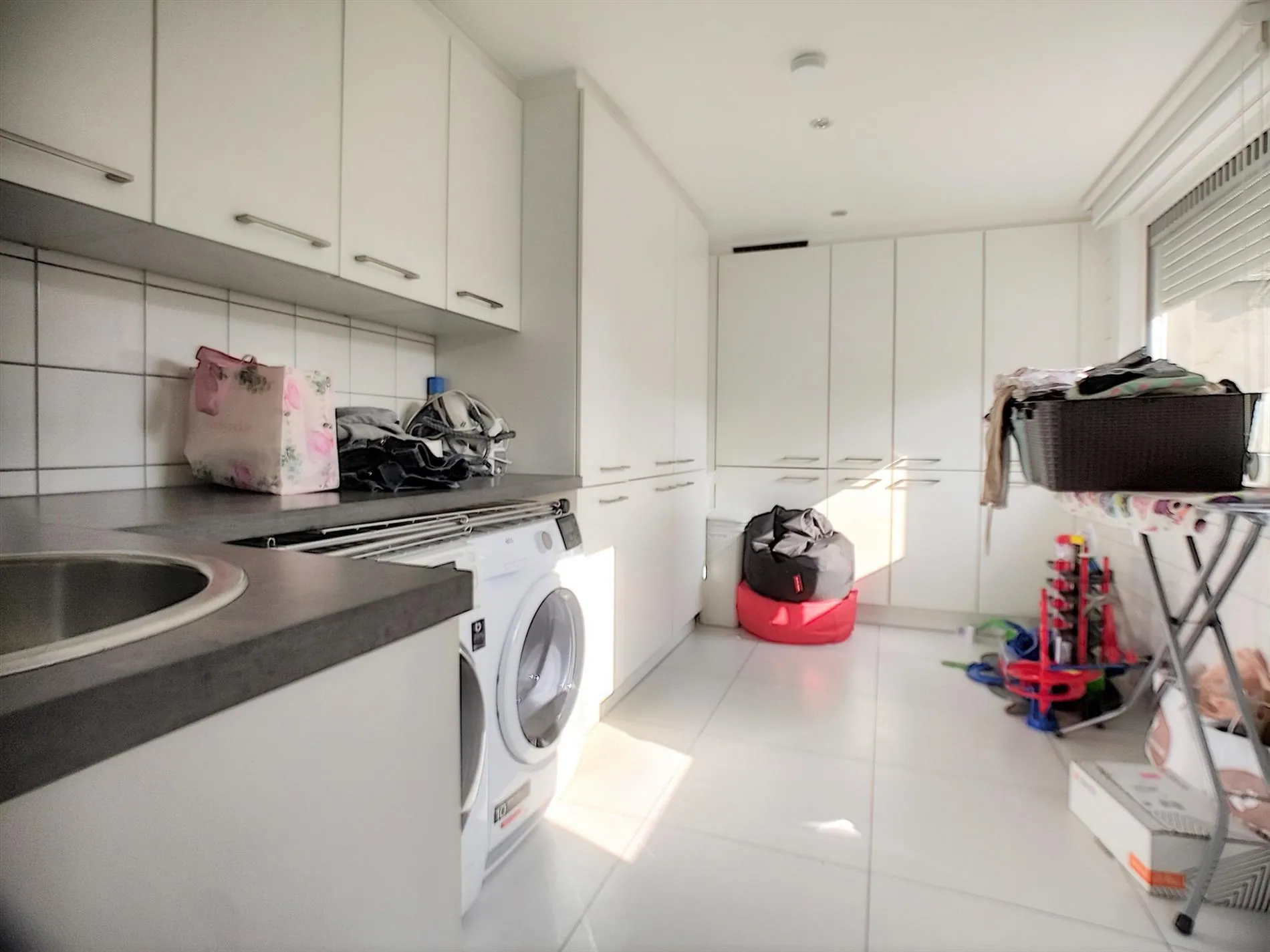 - Grote, zeer praktische berging/wasplaats met tal van ingemaakte kasten.