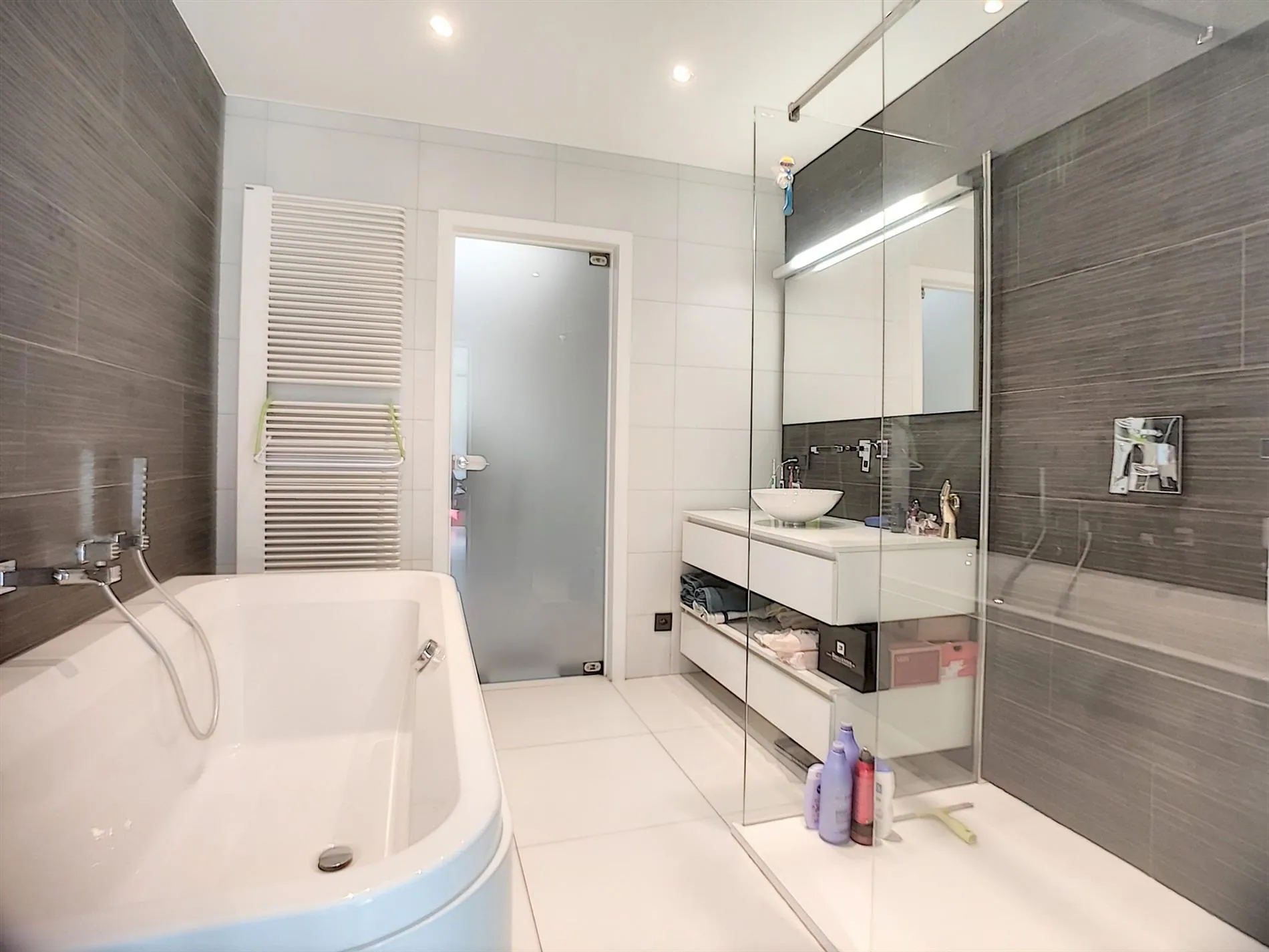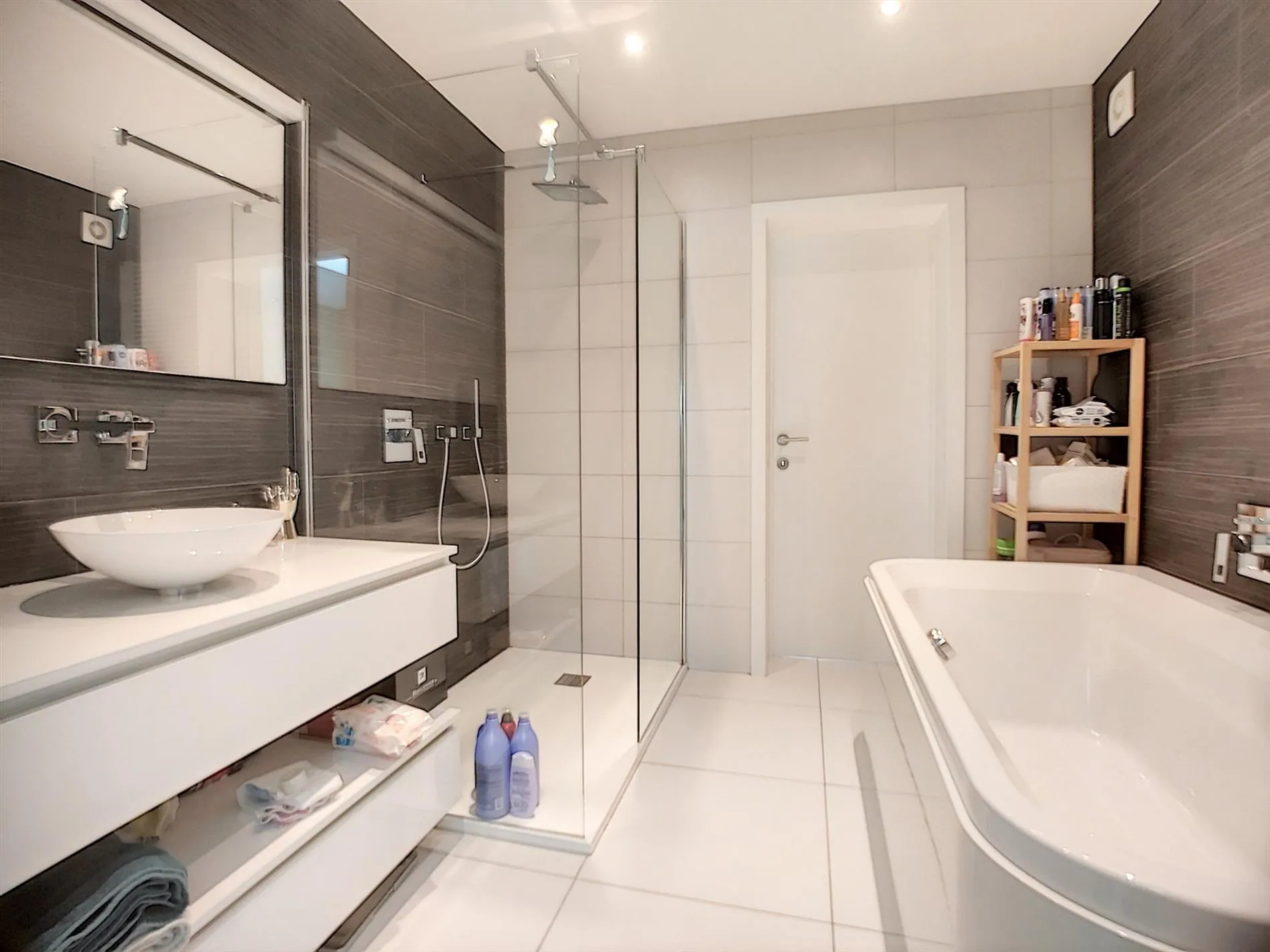 - Zeer knappe badkamer voorzien van ligbad, inloopdouche en wastafel,