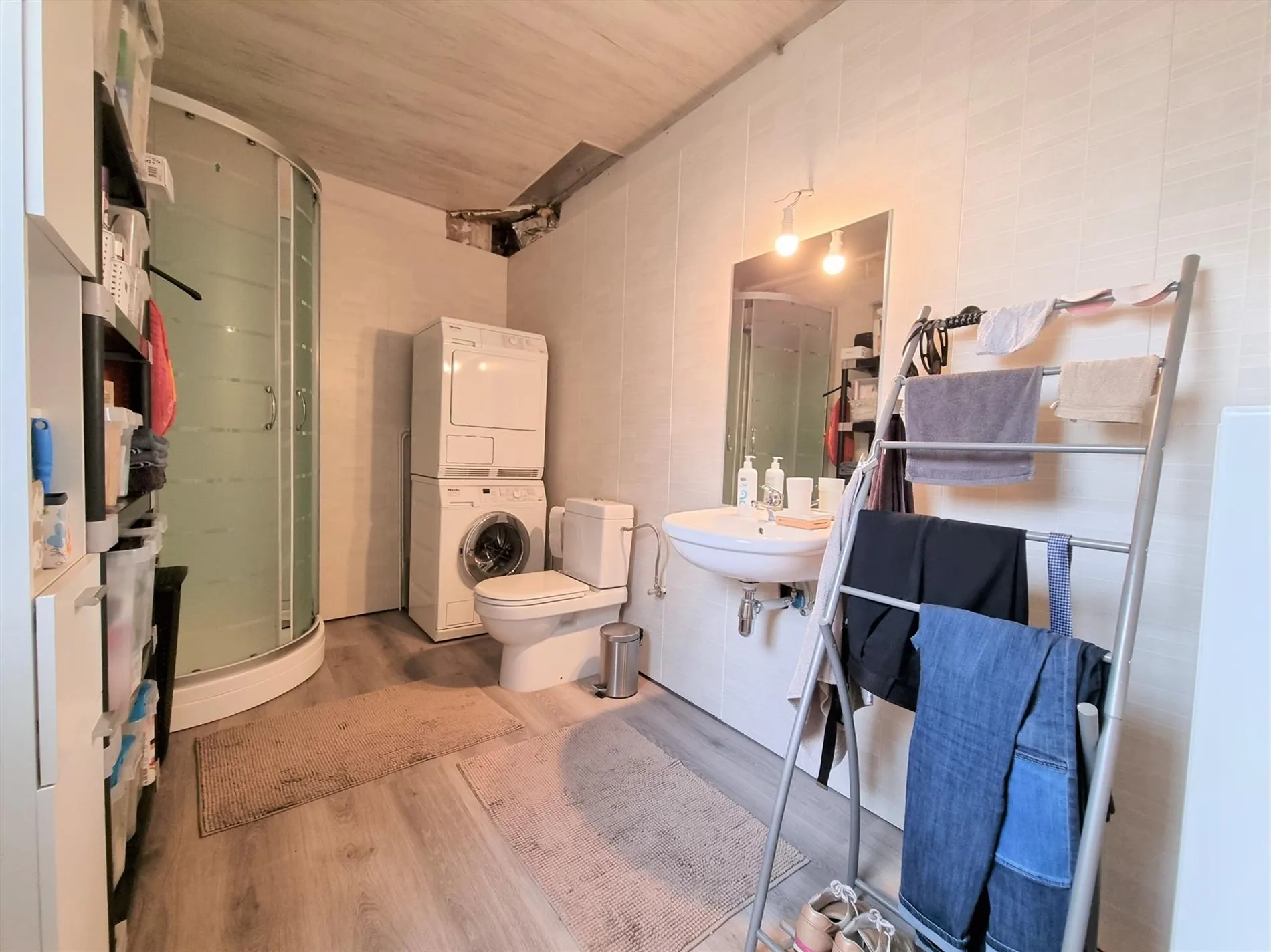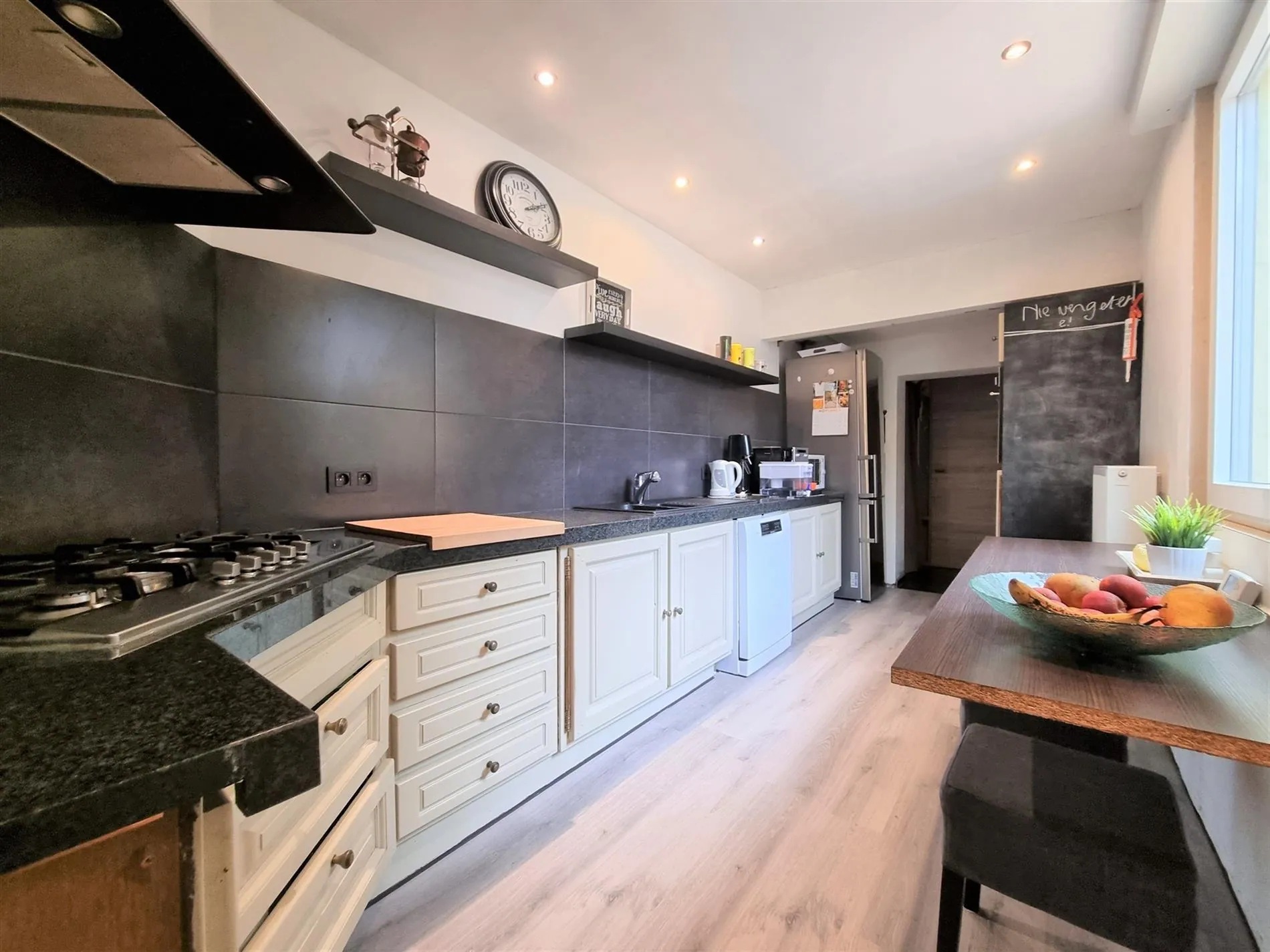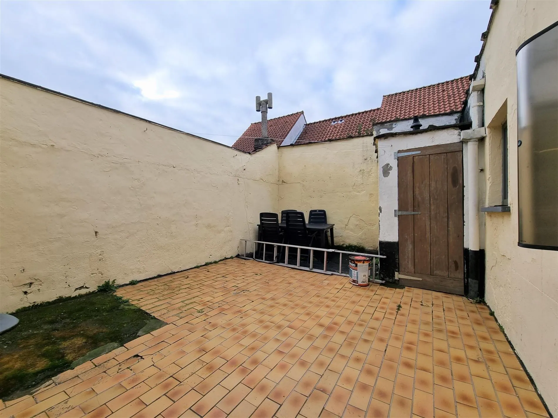 Gelijkvloers: inkomhal met berging, luchtige en vooral brede living met zit- en eethoek, ingerichte keuken, badkamer met douche, lavabo & toilet, wasplaats/berging, groot terras.