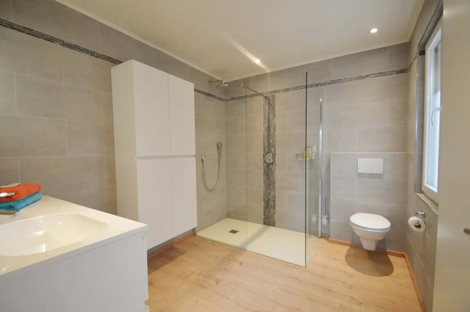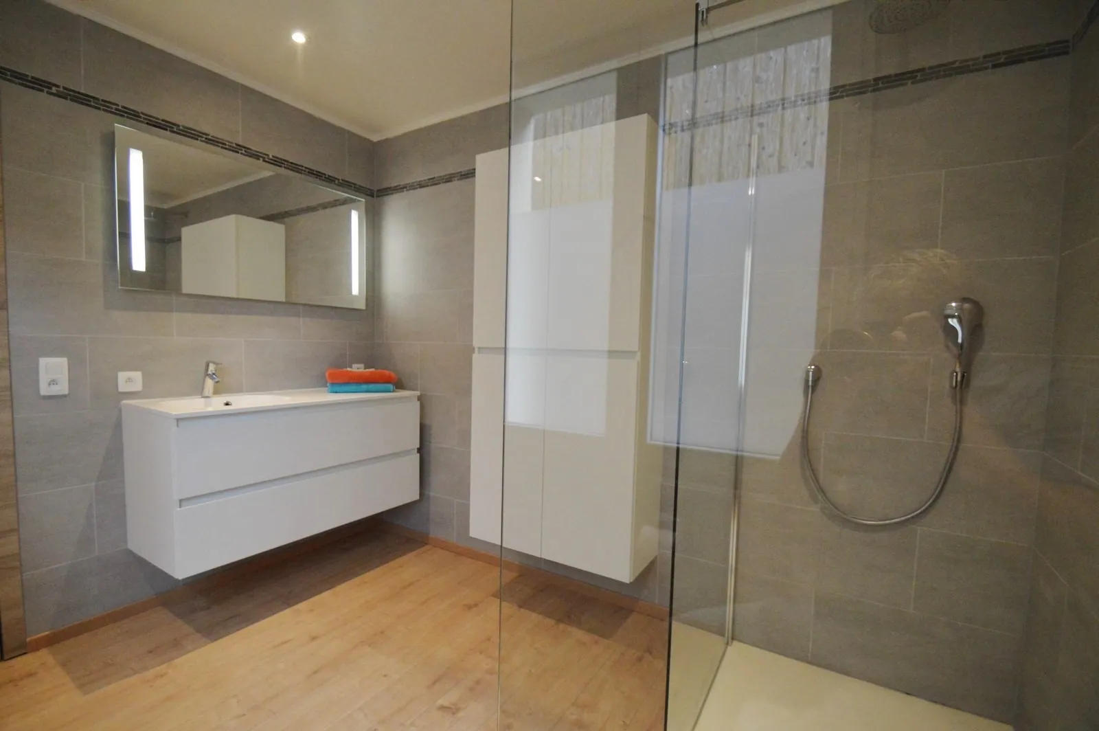 - Knappe badkamer voorzien van inloopdouche, lavabo met bijhorend meubel en een hangtoilet,