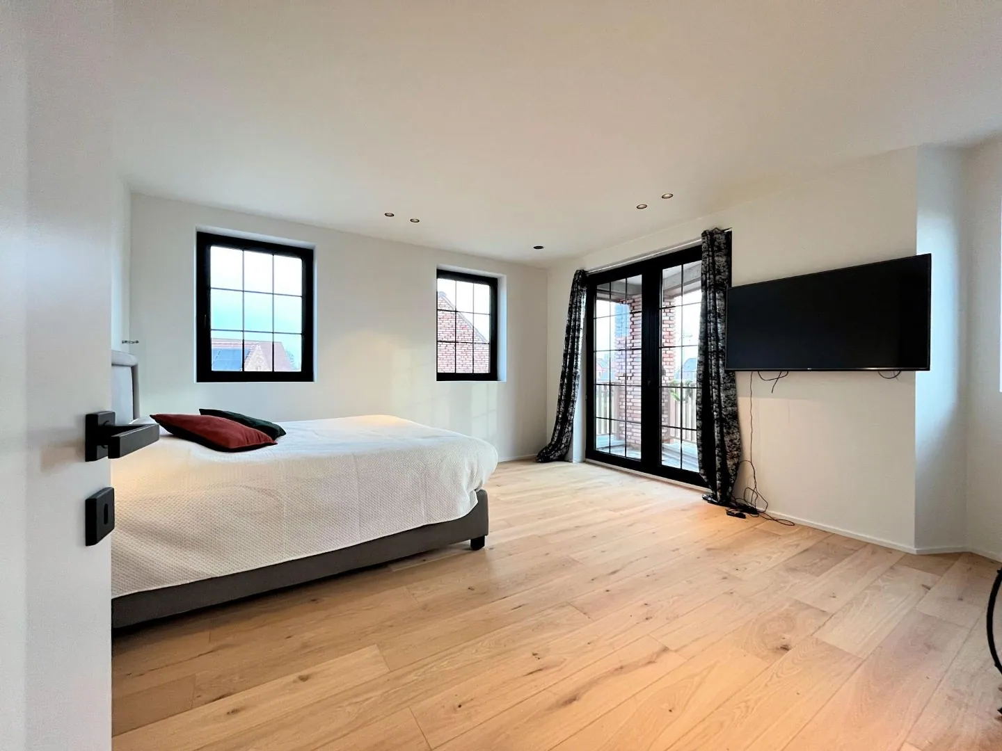 - Volumineuze, lichtrijke woonkamer met parketvloer en toegang tot de zonneterrassen en de (aan te leggen) tuin.