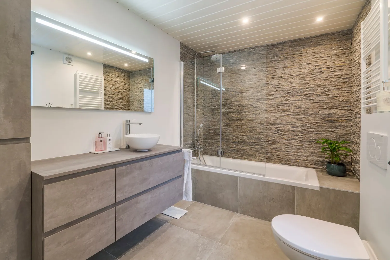 - Nieuwe badkamer voorzien van ligbad met douchescherm, lavabomeubel & toilet.