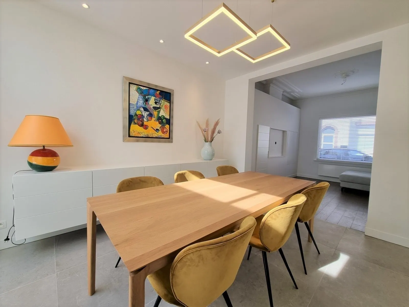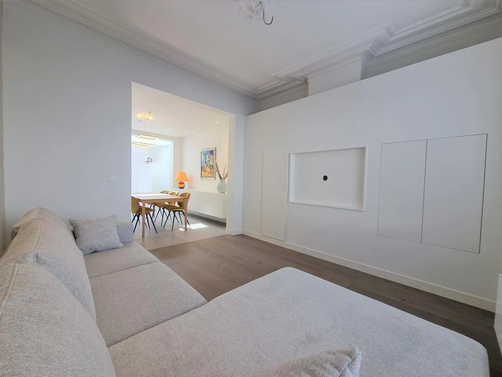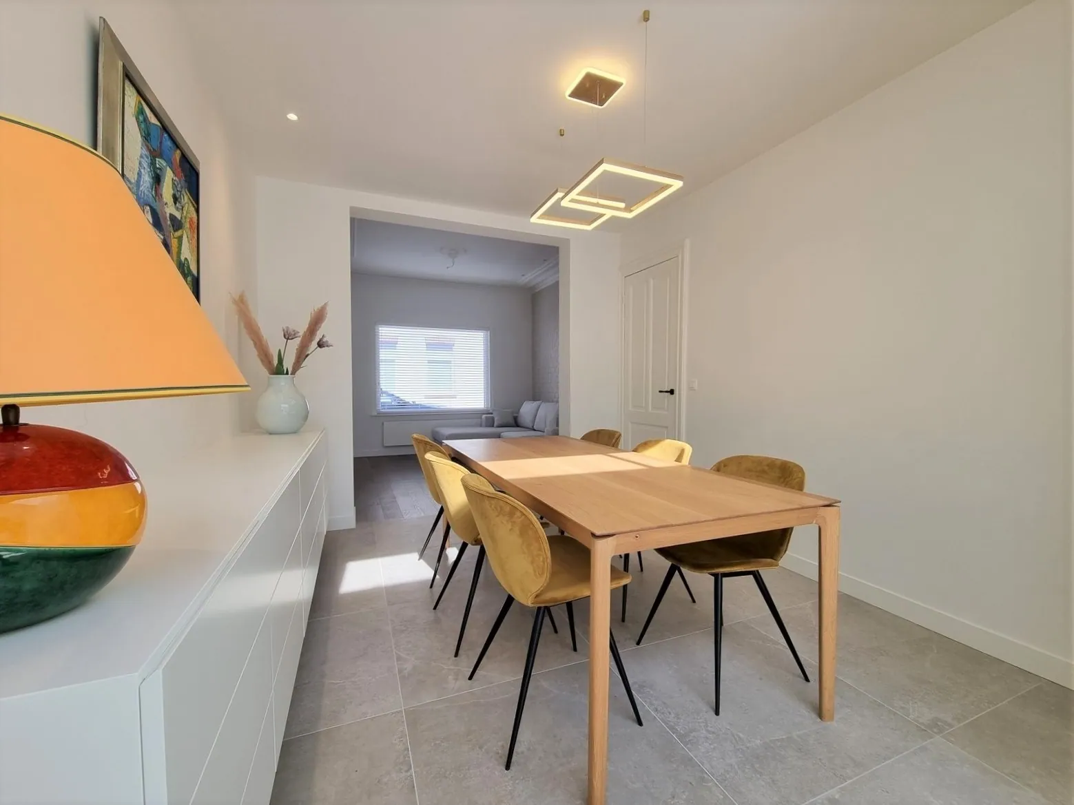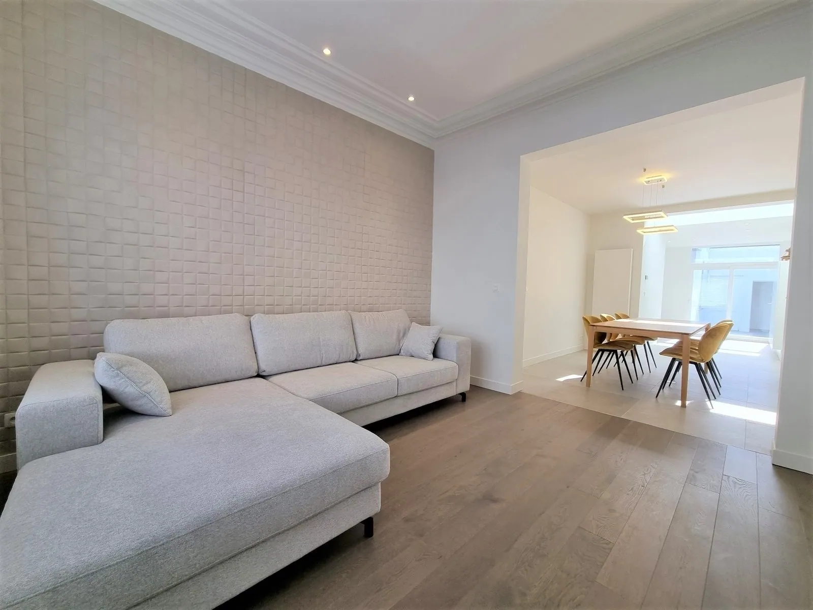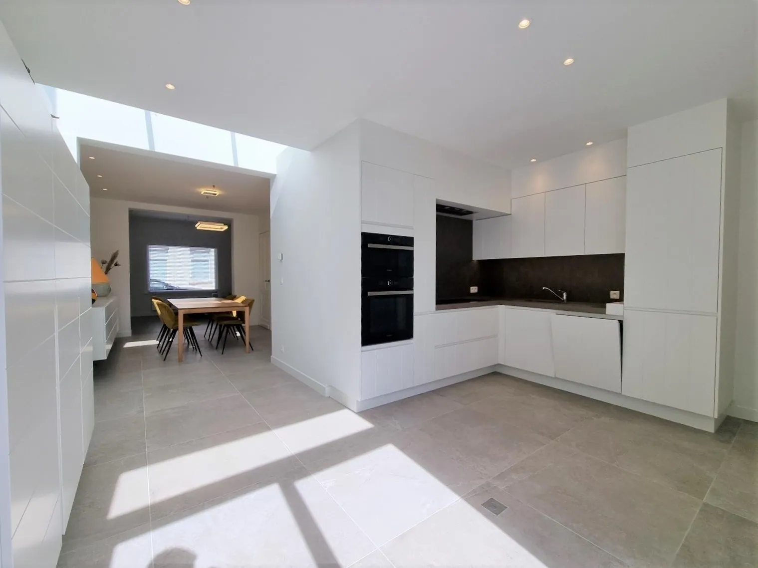 - Living voorzien van zit -en eethoek. Hier werd reeds maatwerk voorzien om de ruimte zo optimaal mogelijk te benutten,