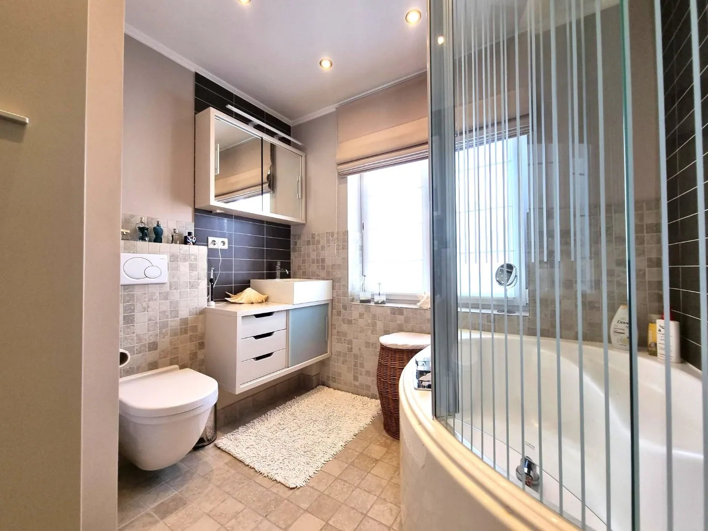 - Mooie badkamer voorzien van ligbad met douchescherm, lavabomeubel & toilet.