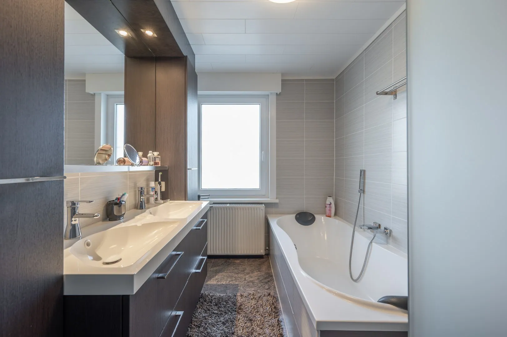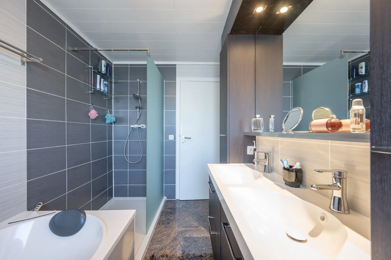 - Badkamer met ligbad, inloopdouche en dubbele wastafel.