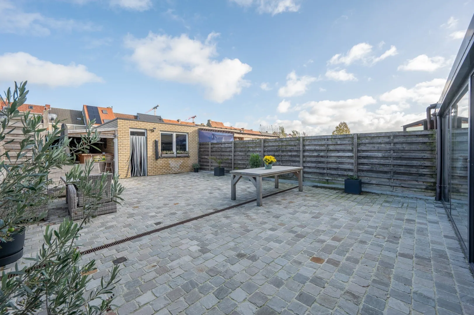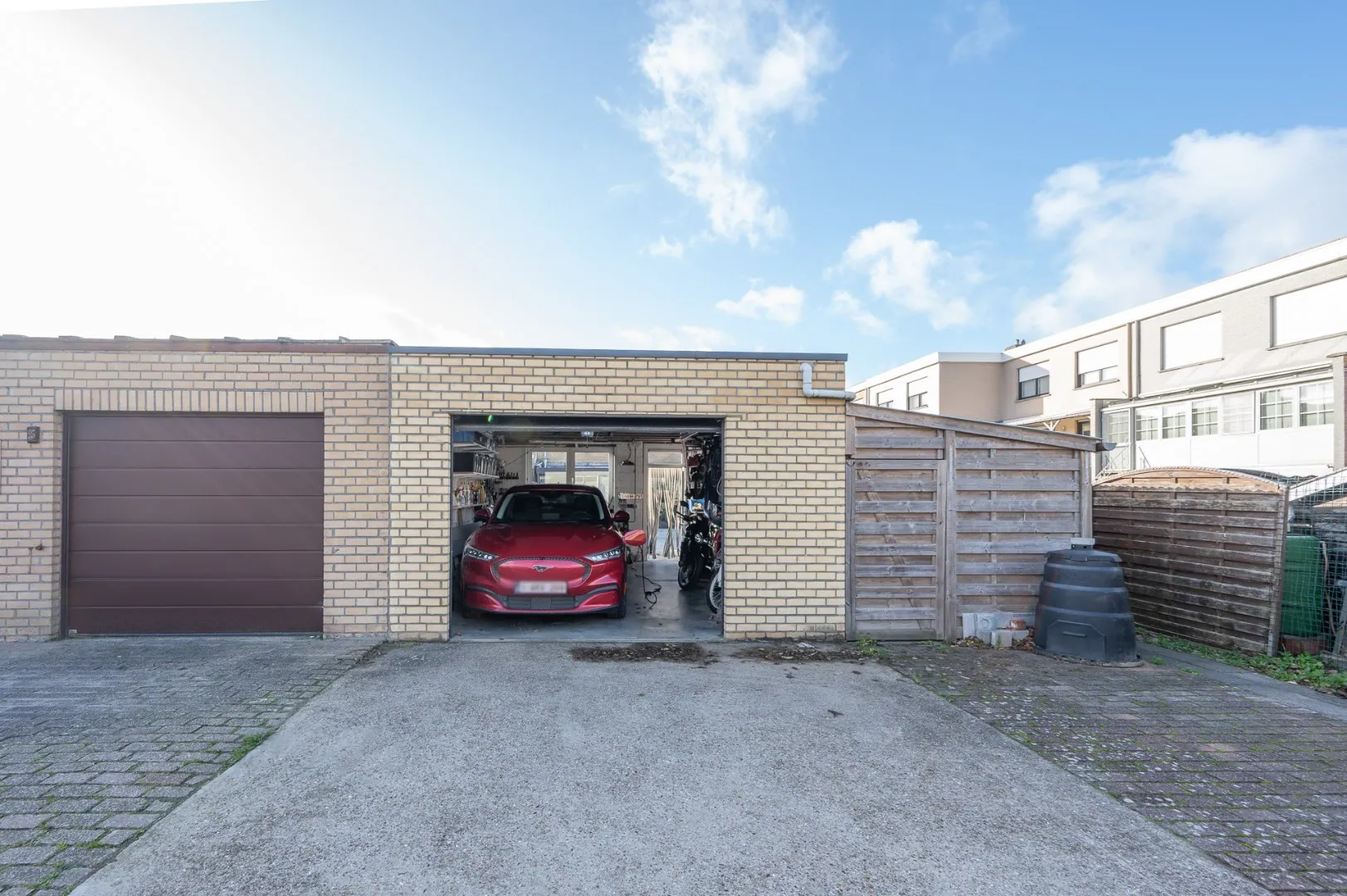 - Mooi aangelegd zonneterras met toegang tot de achtergelegen garagebox. Hier kunnen ook weer twee wagens worden geparkeerd.
