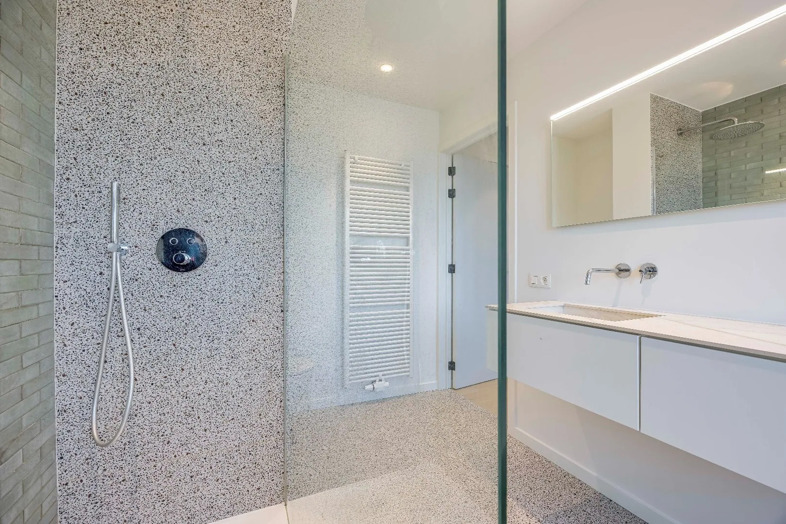 - Luxueus afgewerkte badkamer met inloopdouche, dubbele wastafel en toilet,