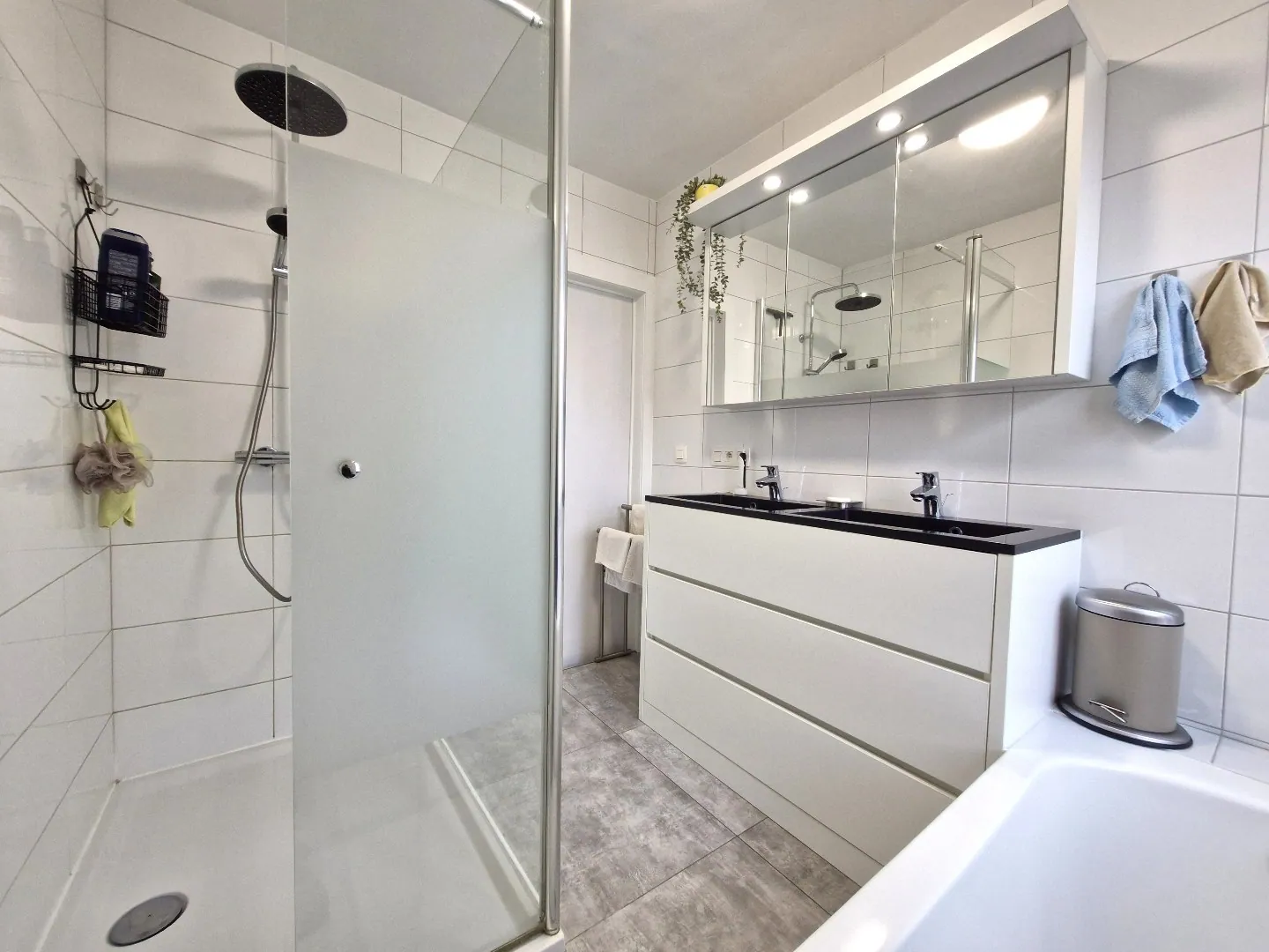 - Badkamer met ligbad, dubbele wastafel en inloopdouche,