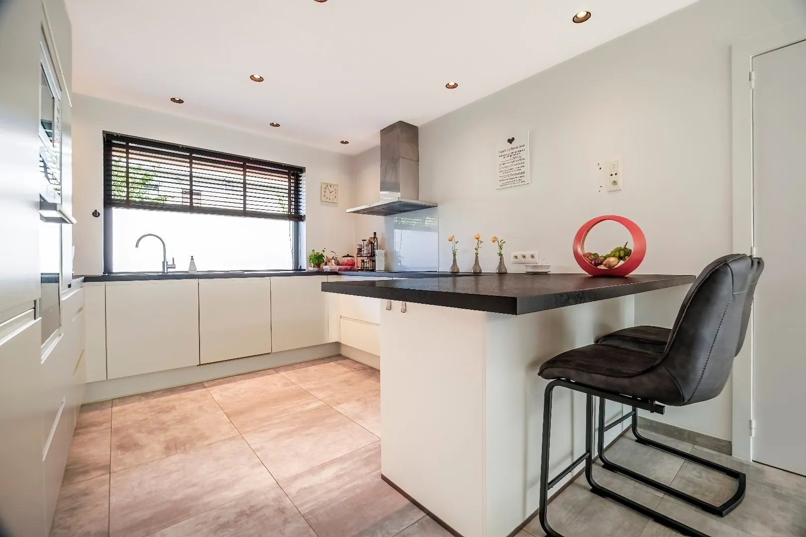 De leefruimte geniet van een indrukwekkende lichtinval dankzij de grote raampartijen en lichtstraat, en het schuifraam verbindt de woning op een natuurlijke manier met de zuidgerichte tuin.