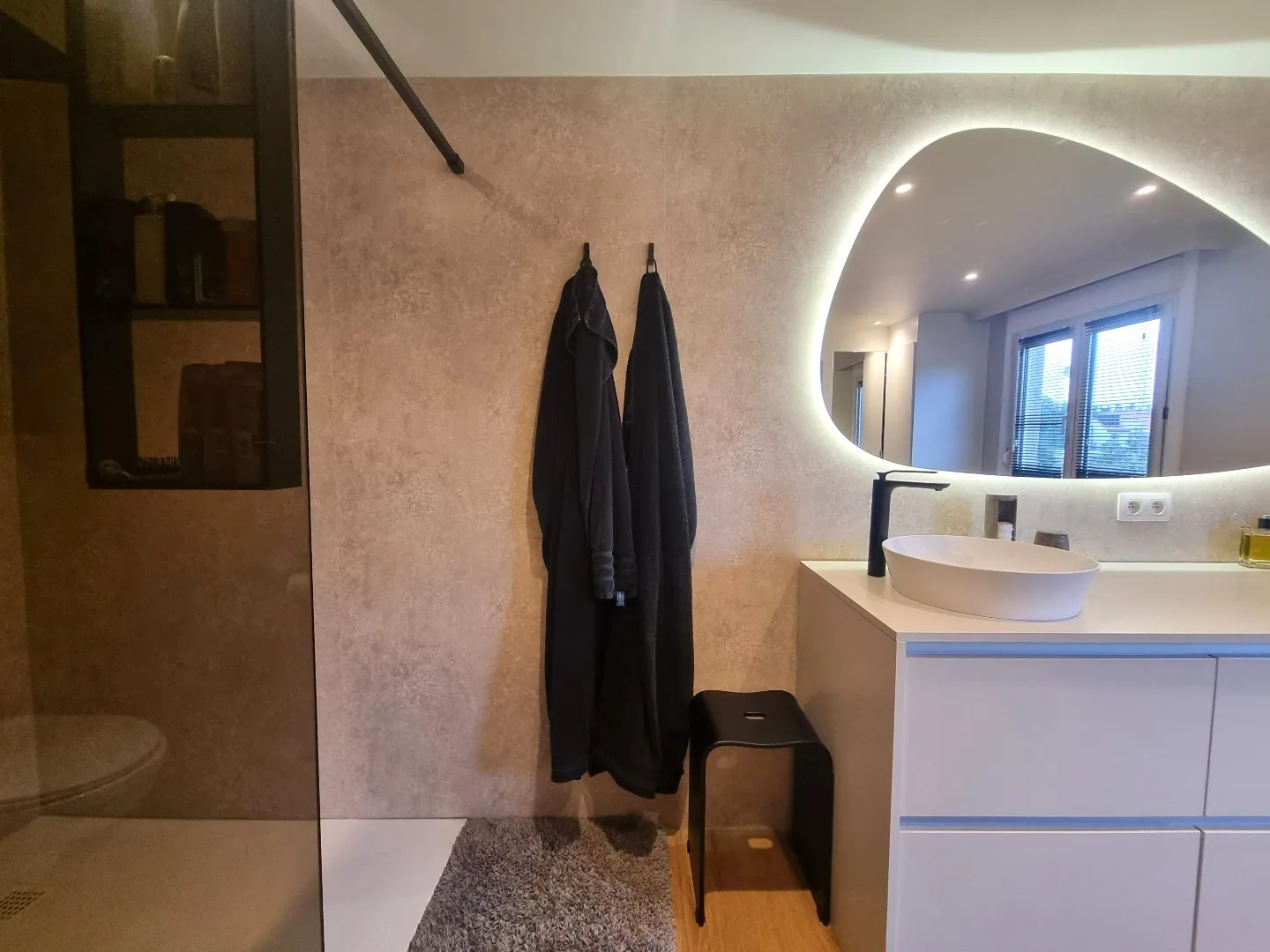 - Knappe badkamer voorzien van inloopdouche en lavabomeubel,