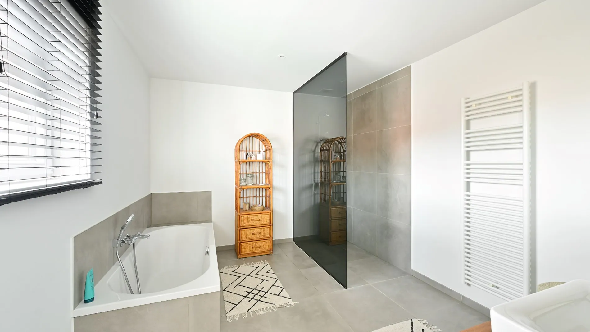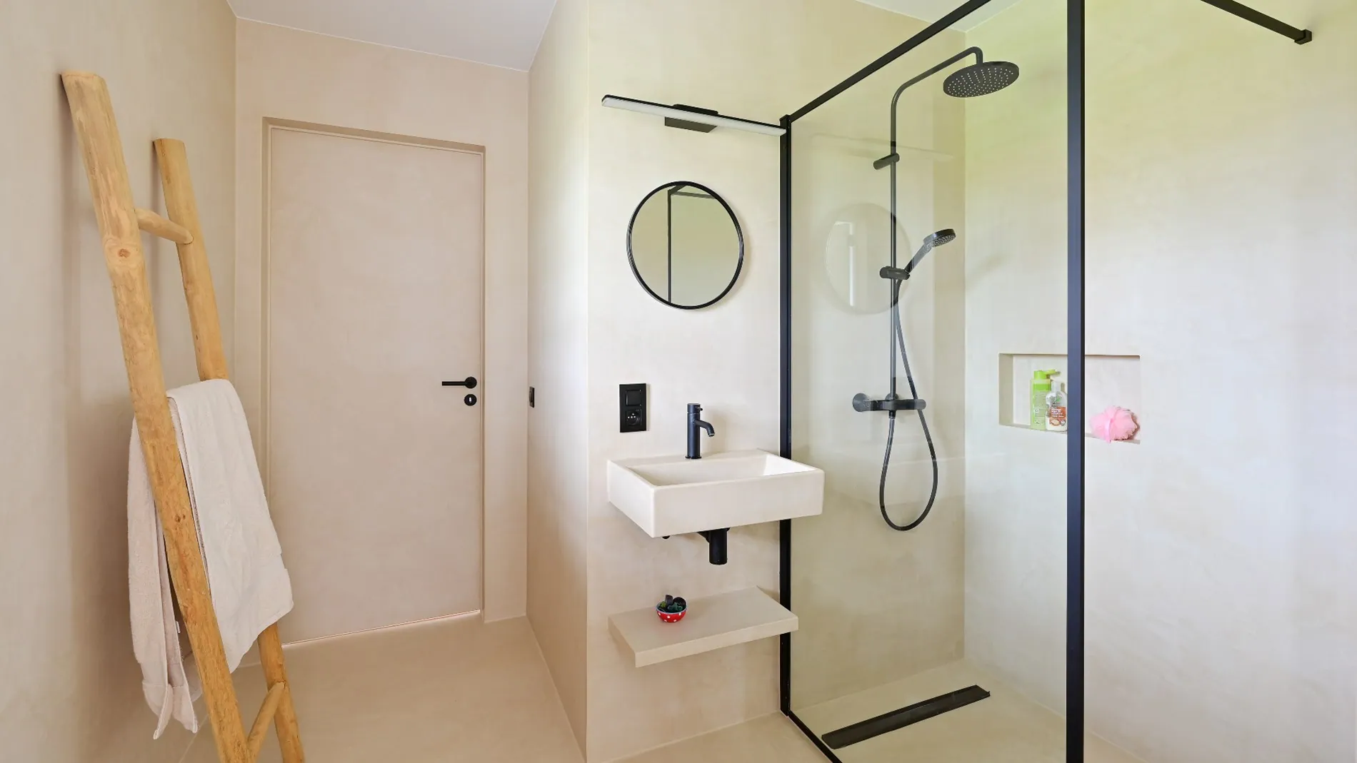 - Onderhoudsvriendelijke badkamer afgewerkt in mortex.