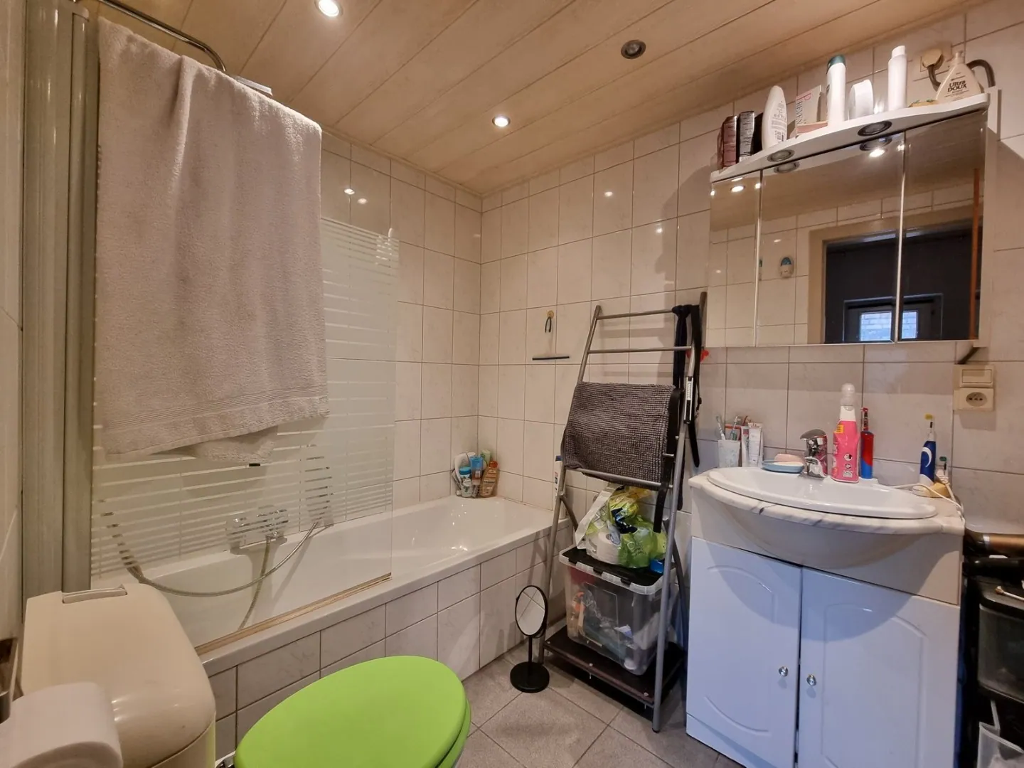 - Badkamer voorzien van ligbad, lavabomeubel & toilet,