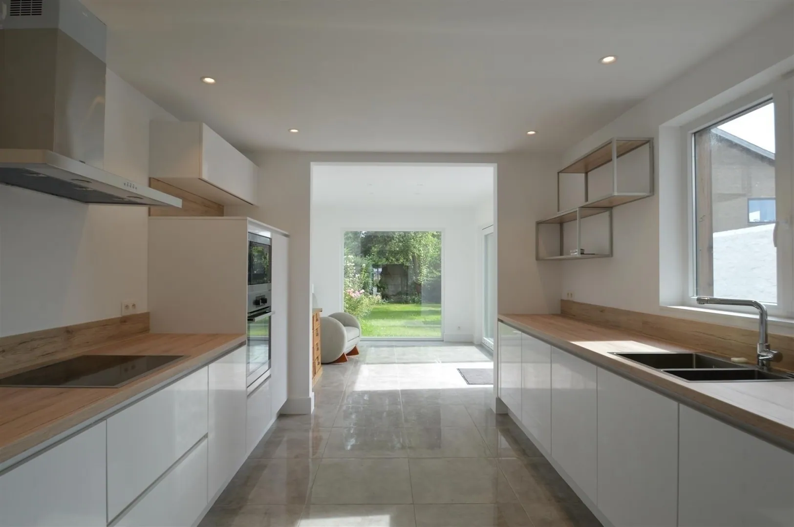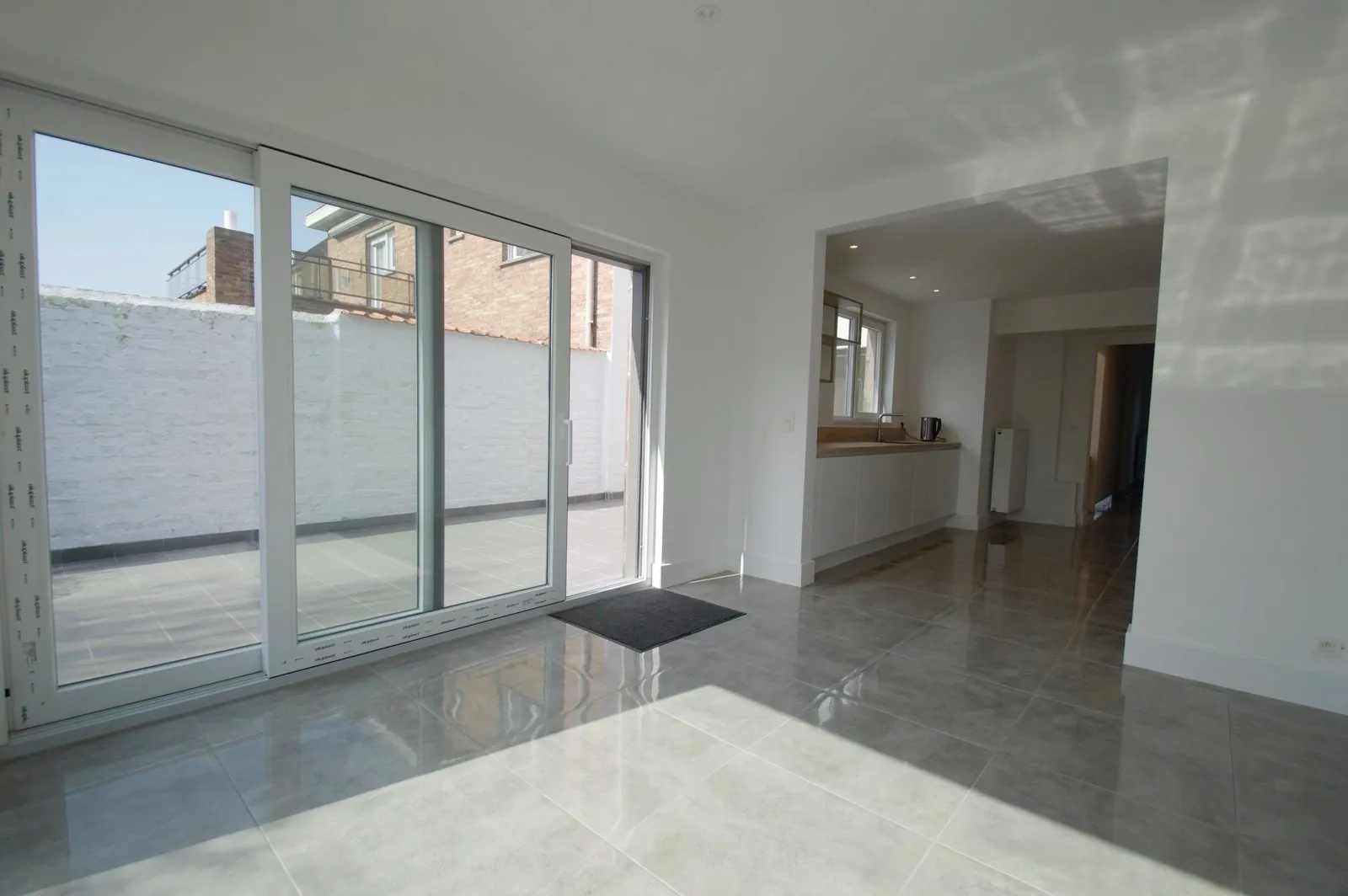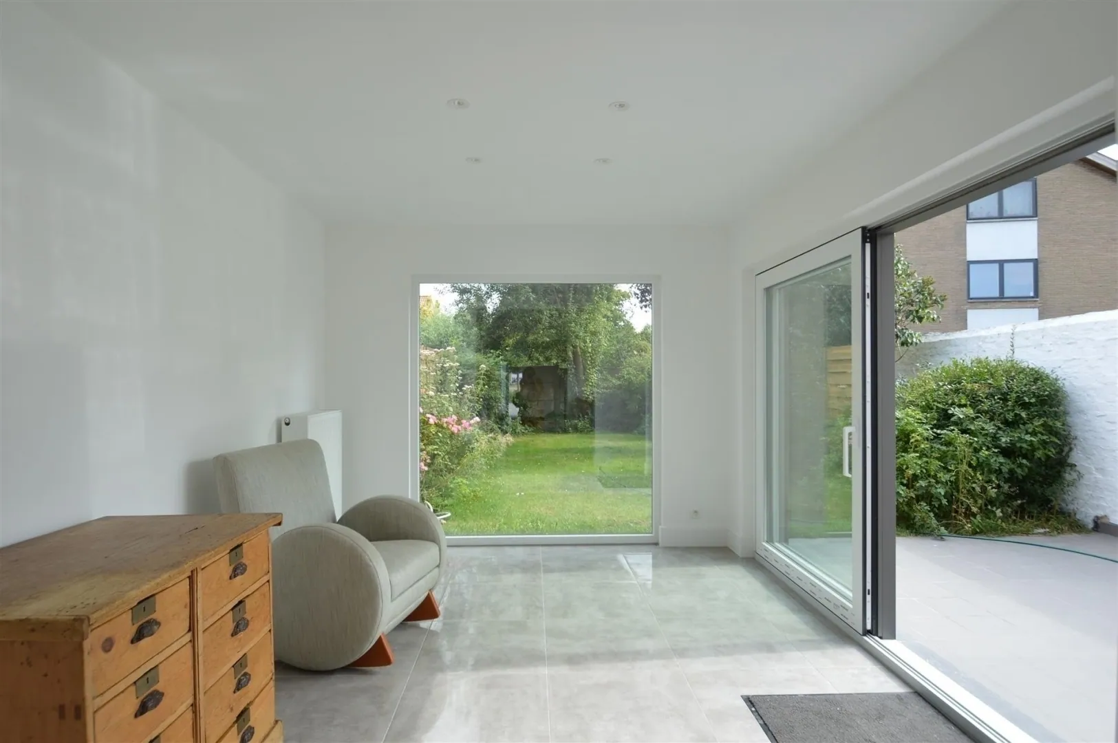 - Toegang vanuit de living en eetplaats tot het nieuwe aangelegde terras en de tuin,