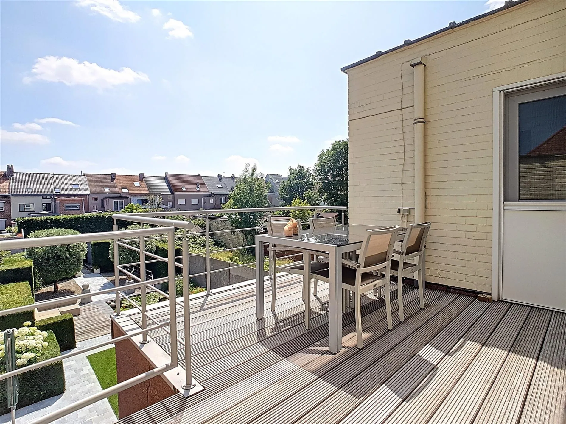 - Terras grenzend aan de leefruimte/keuken en met toegang naar de tuin via de trap,