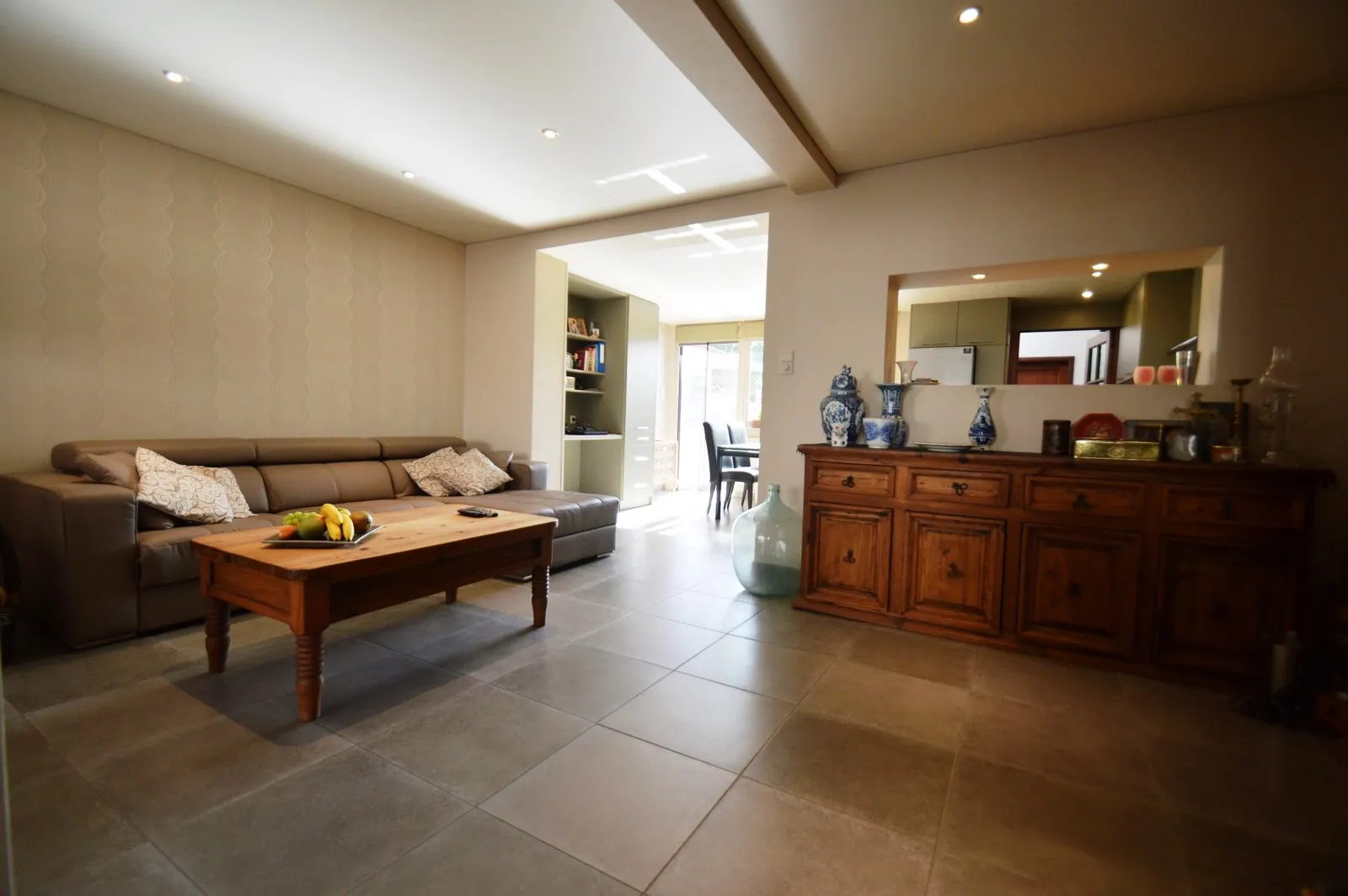 Inkom, goed ingedeelde leefruimte met zit- en eethoek voorzien van cassettehaard, knappe, volledig ingerichte leefkeuken, wasplaats, toilet, zeer ruime berging/hobbyruimte, aangelegde tuin/terras voorzien van bar, achteruitgang via de dubbele garage